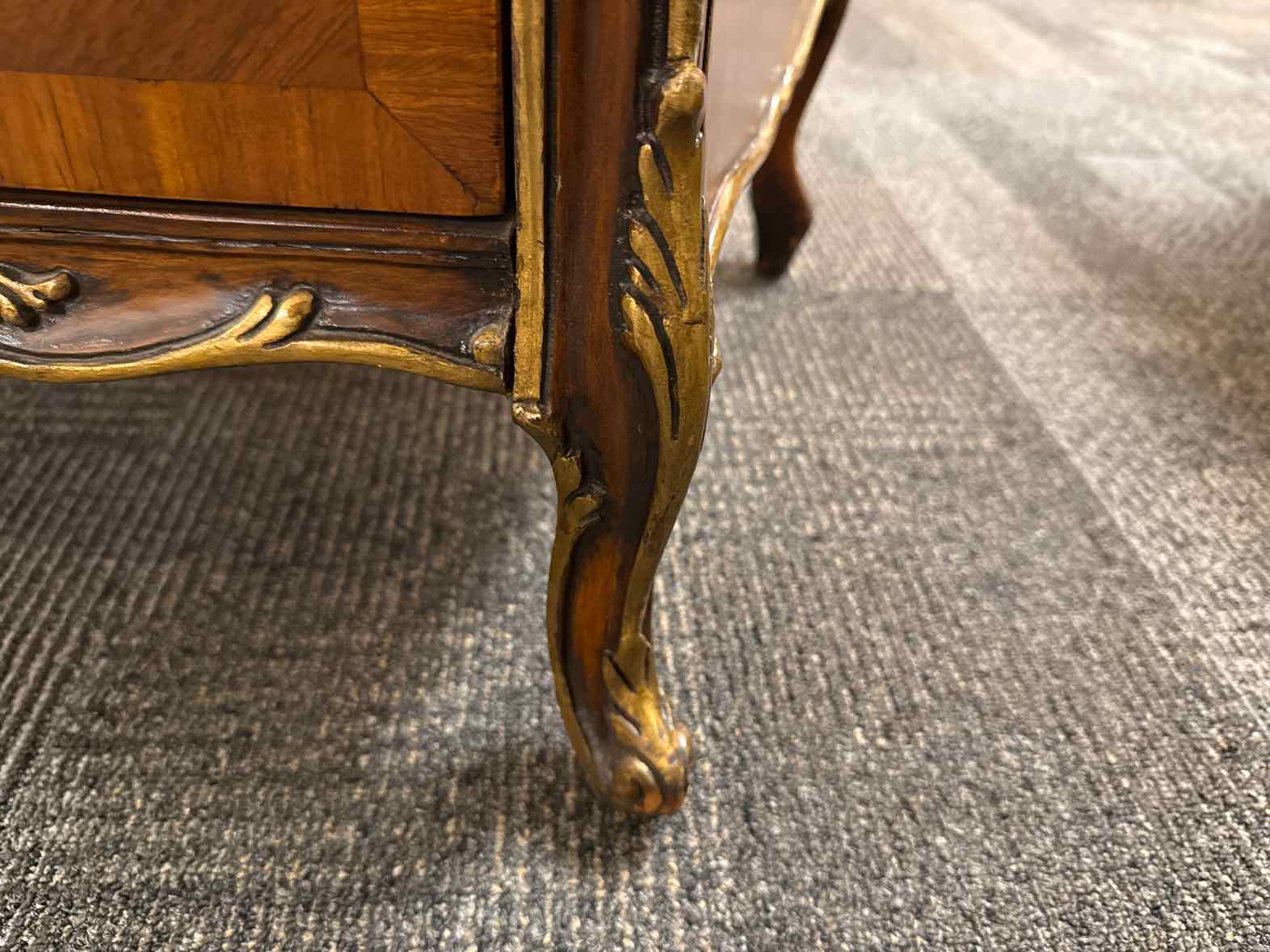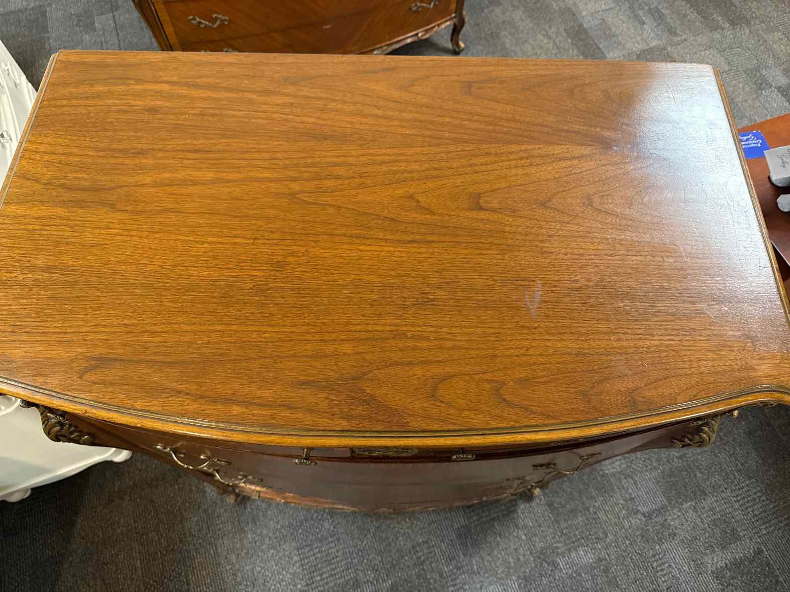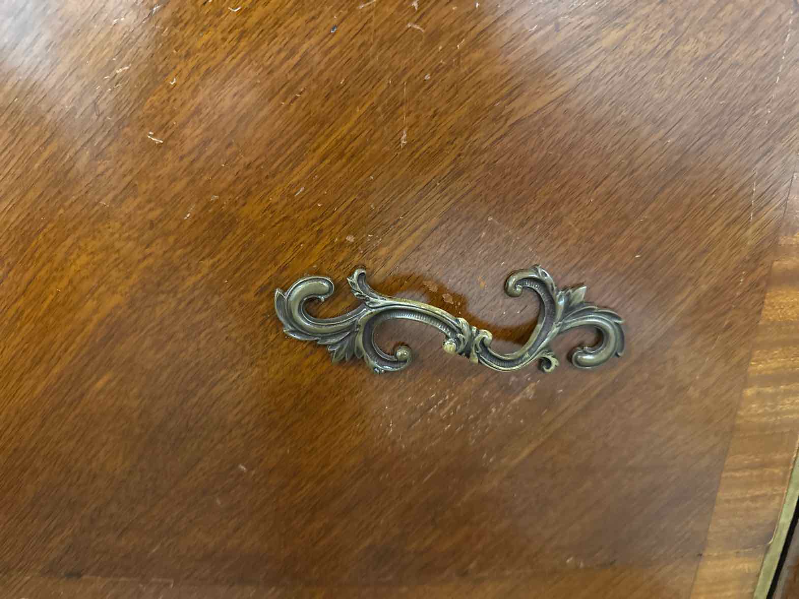 Antique 6-drawer French provincial inlaid tall chest, bow front, decorative brass pulls, painted gold accents