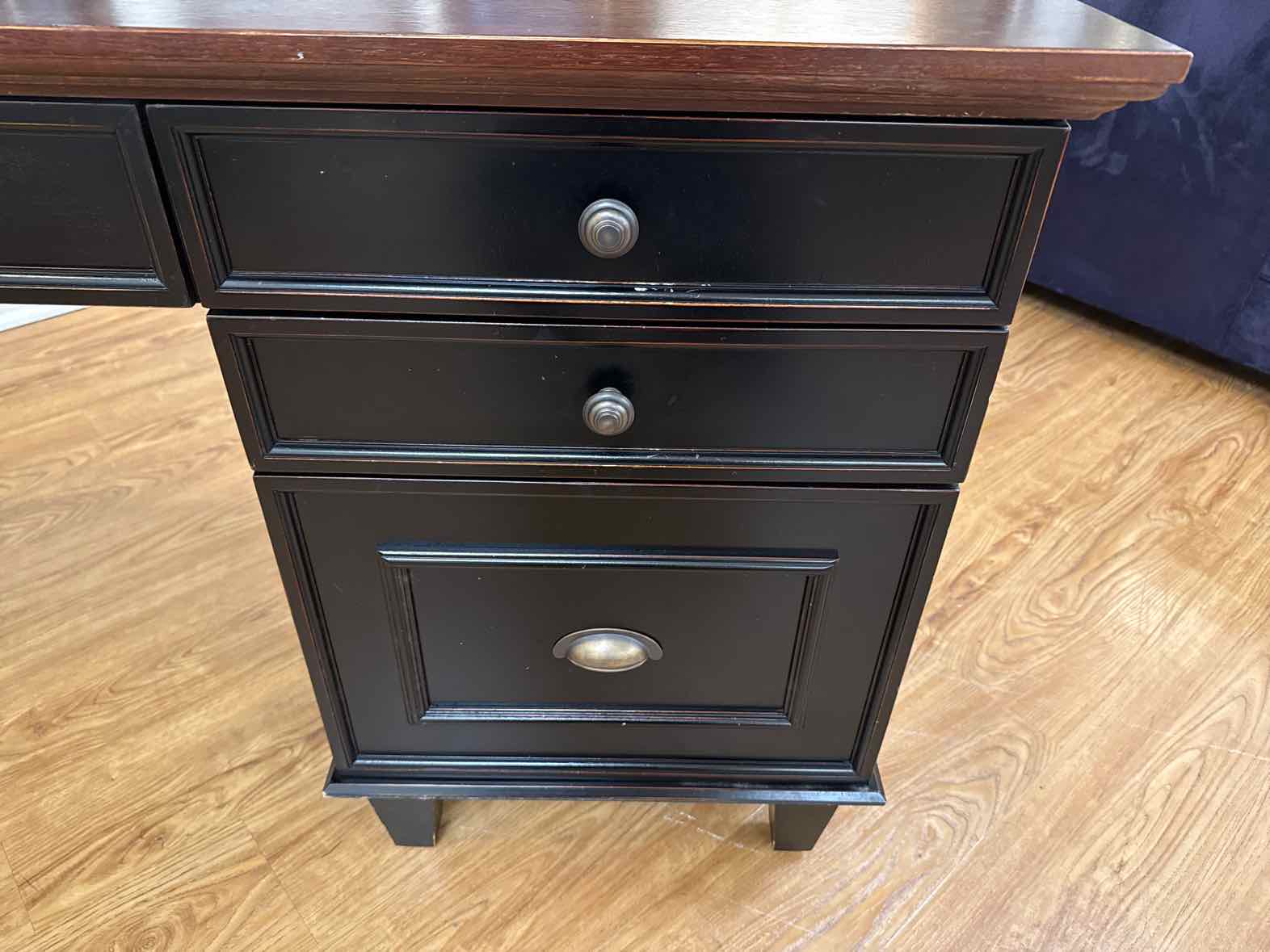 2-drawer desk with filing cabinet w/ dovetailed drawers, distressed black base and cherry top, cup drawer pulls