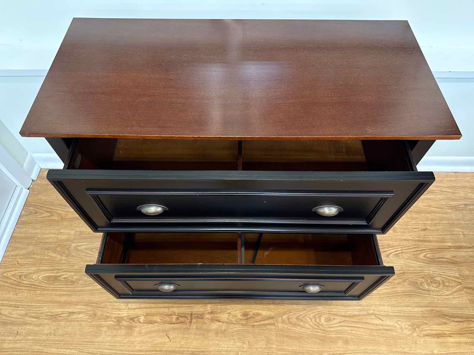 2-drawer lateral filing cabinet w/ dovetailed drawers, distressed black base and cherry top, cup drawer pulls