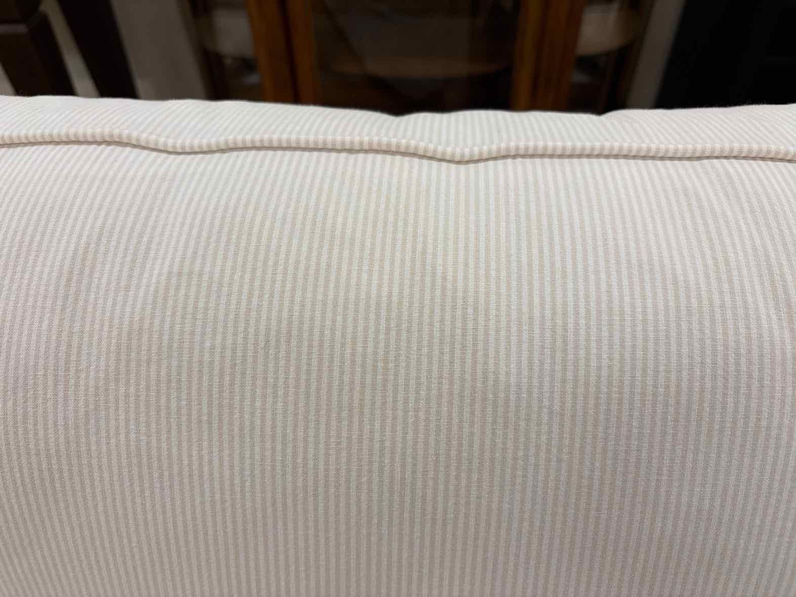'Baldwin' slipcovered 3-seat sofa in taupe & cream pinstripe fabric, sock arm and espresso foot