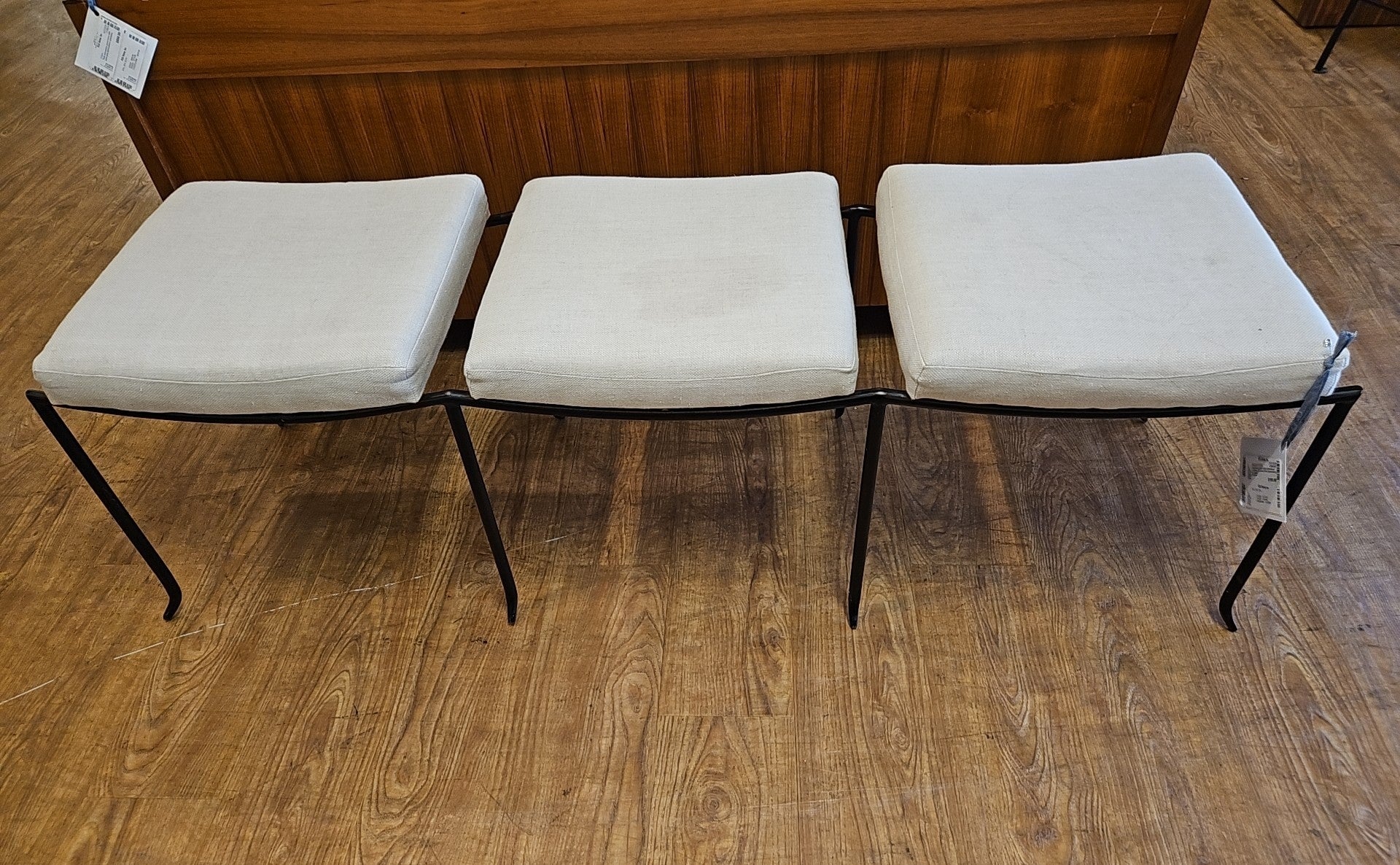 3-seat bench with taupe upholstered cushions, iron base (some discoloration on seats)