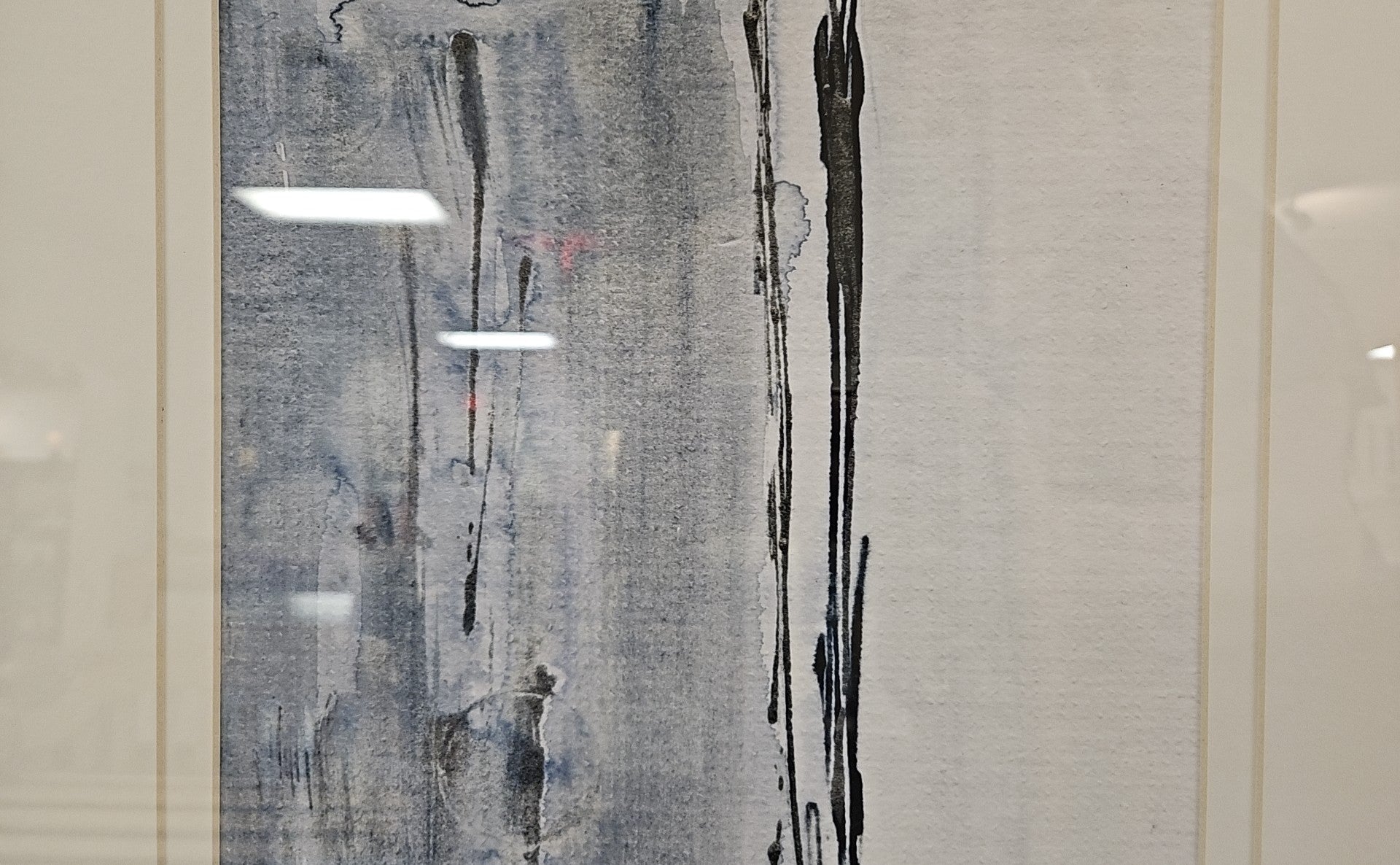 'At the Dawn D' inky watercolor cool-tone abstract, white mat and distressed black frame
