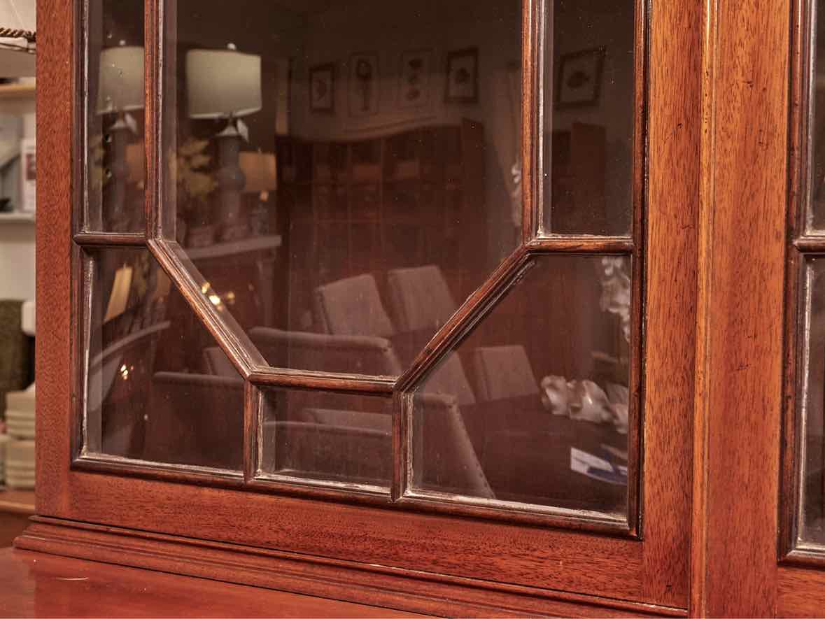 Mahogany 2 Piece Drop Down Desk Secretary with 2 Glass Doors & 4 Drawers with Brass Chippendale Handles
