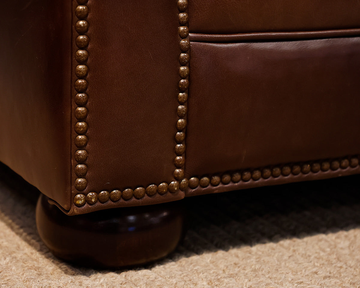 Brown Leather Two-Piece Sectional. Rolled Arm With Brushed Bronze Nailhead Trim.