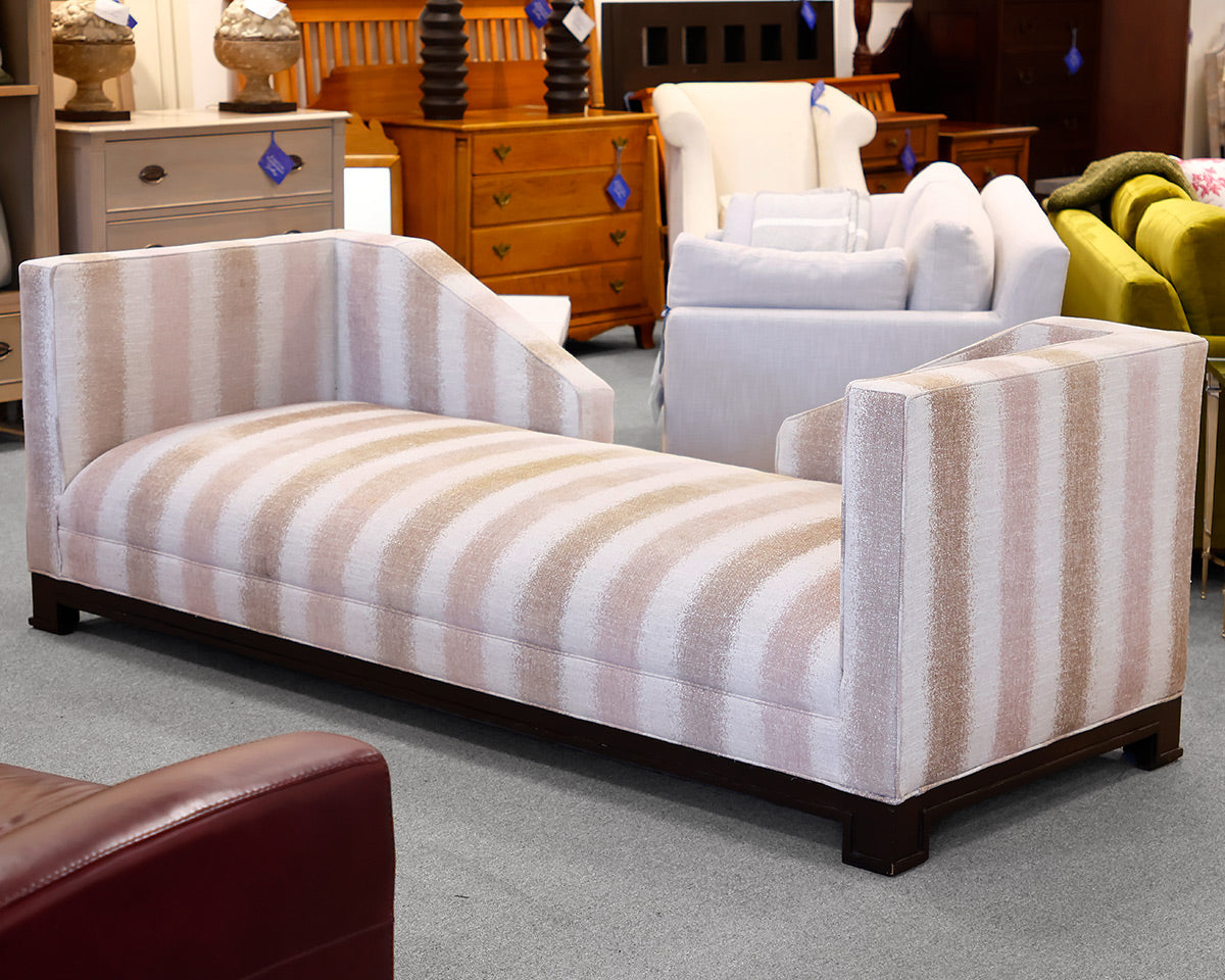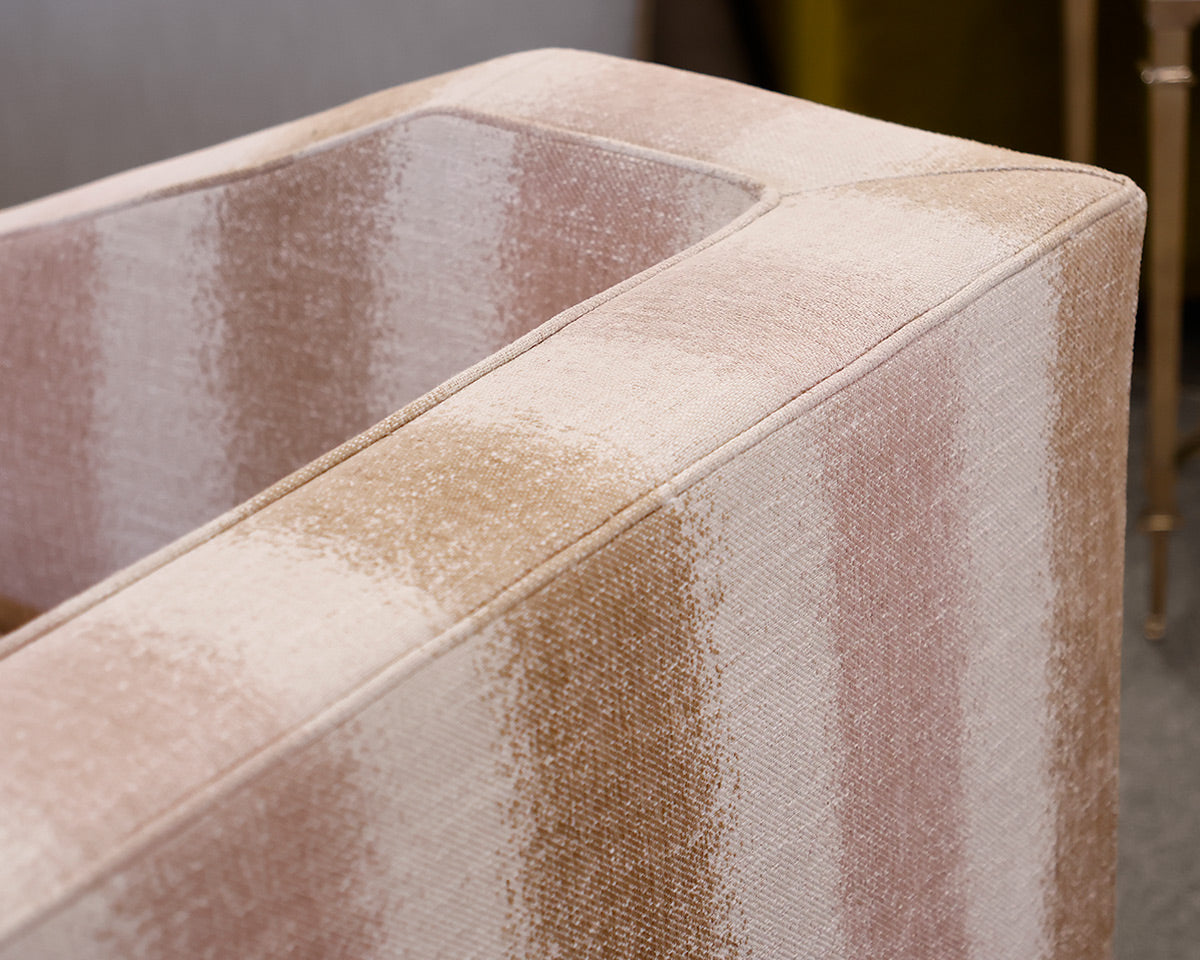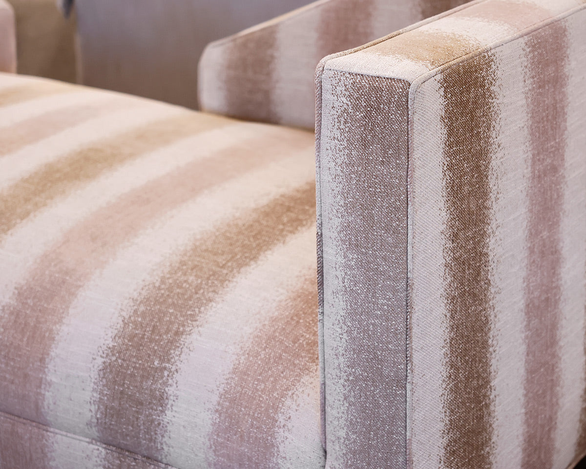 Tete- a Tete in a striped ivory, mauve, and wheat upholstery