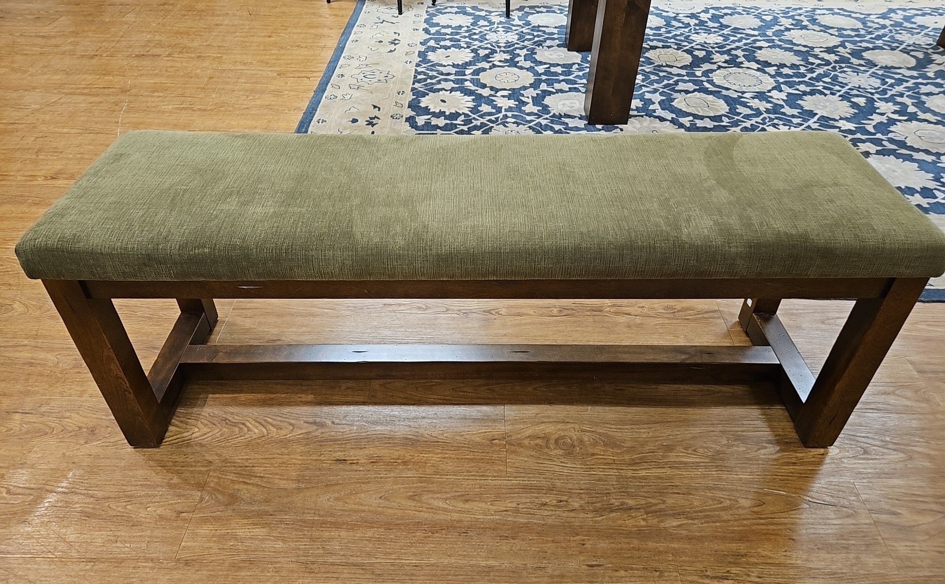 'Loft' dining set in cognac finish with glass top table, 4 wide-slat chairs, dining bench with olive fabric