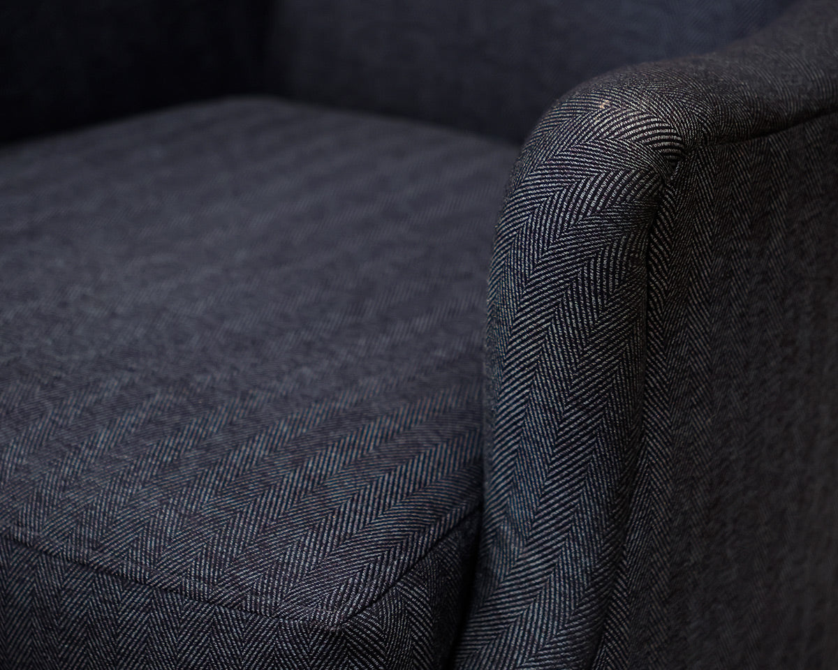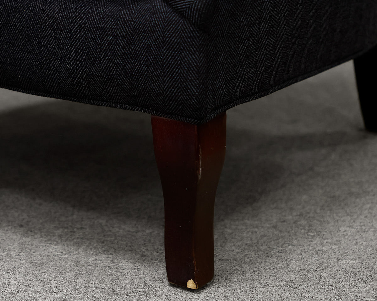 Pair of Crate & Barrel side chairs. Charcoal gray herringbone fabric with tapered legs in an espresso finished. Sloped arms.