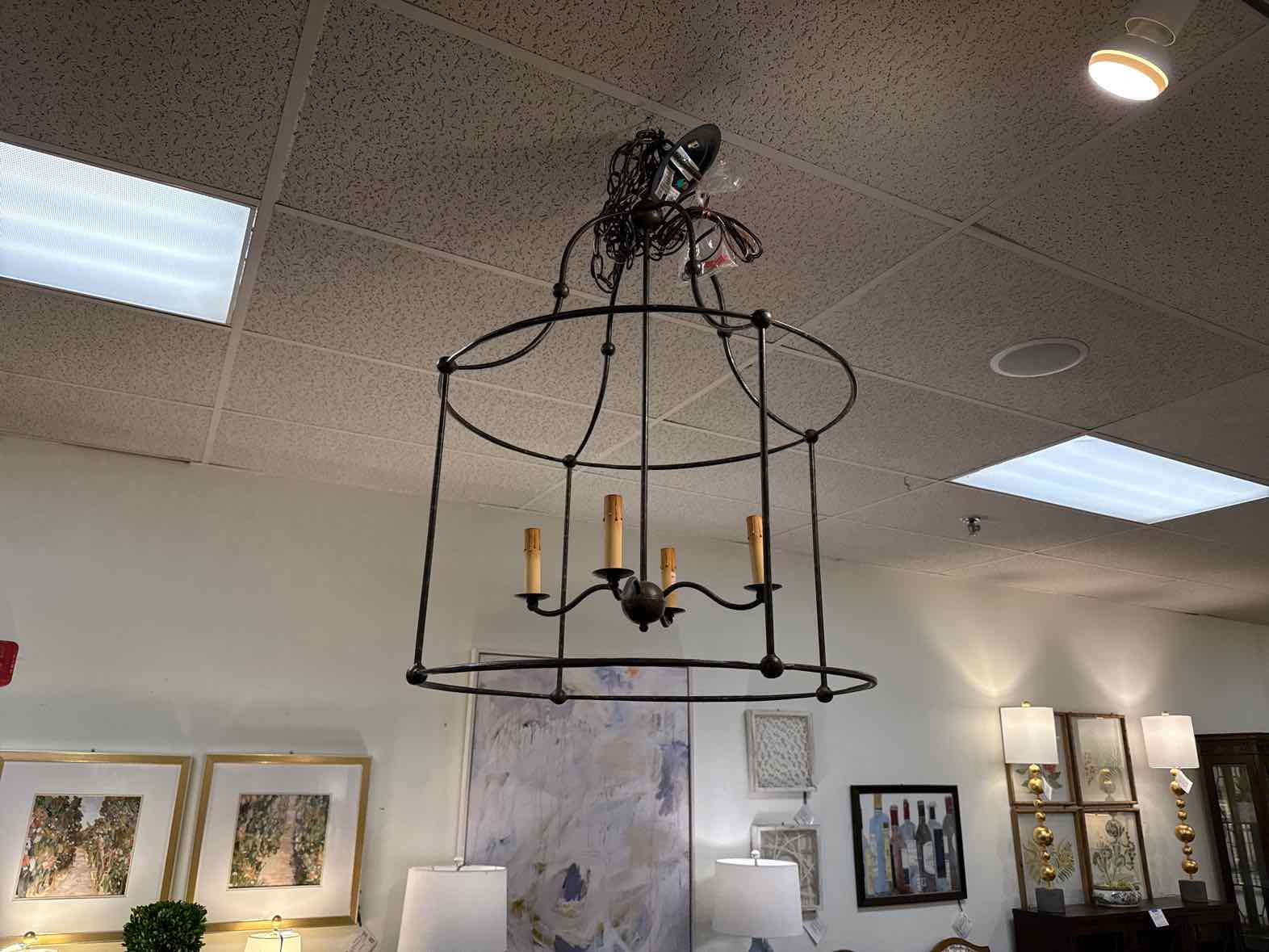 'Fitzjames' dimmable four light open cage wrought iron chandelier