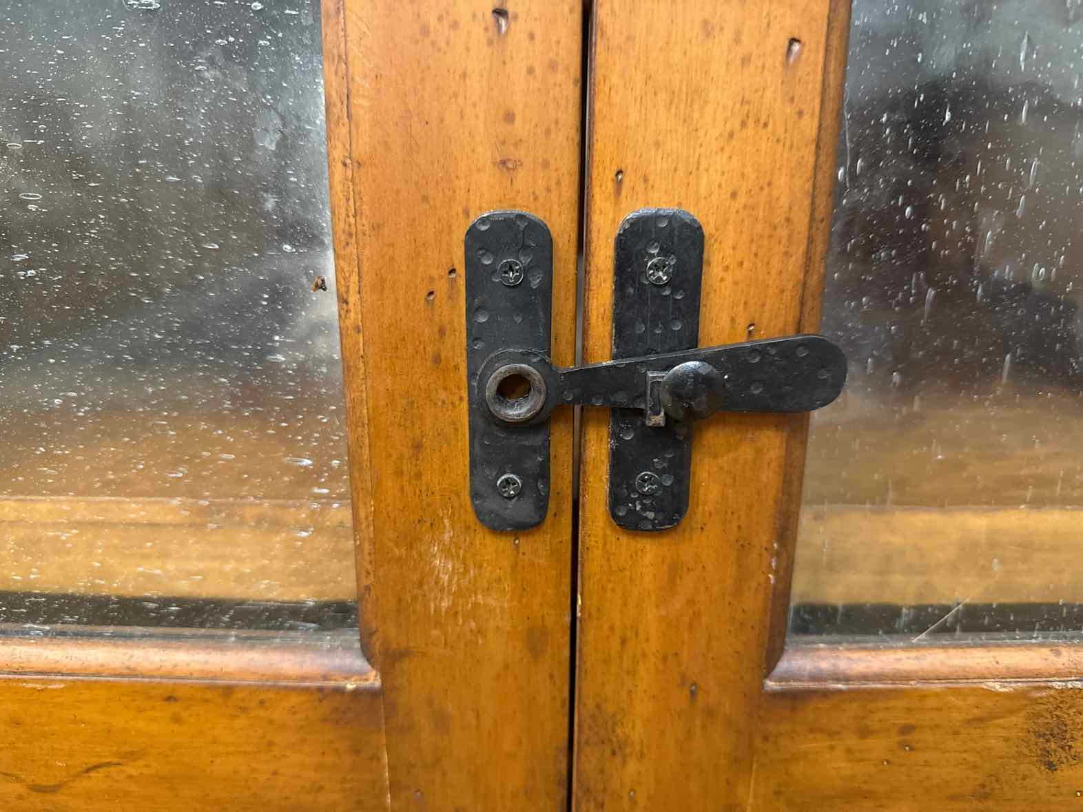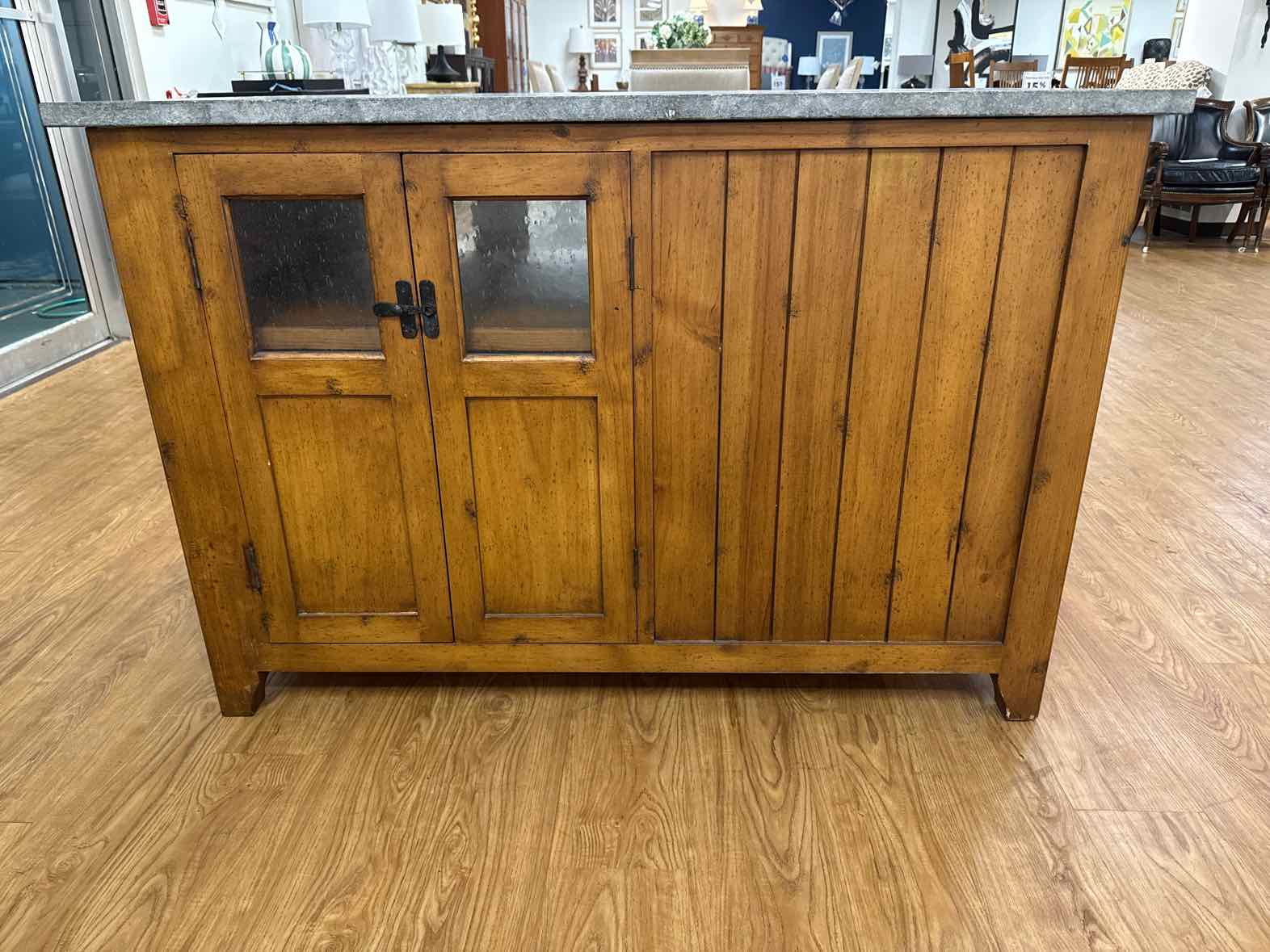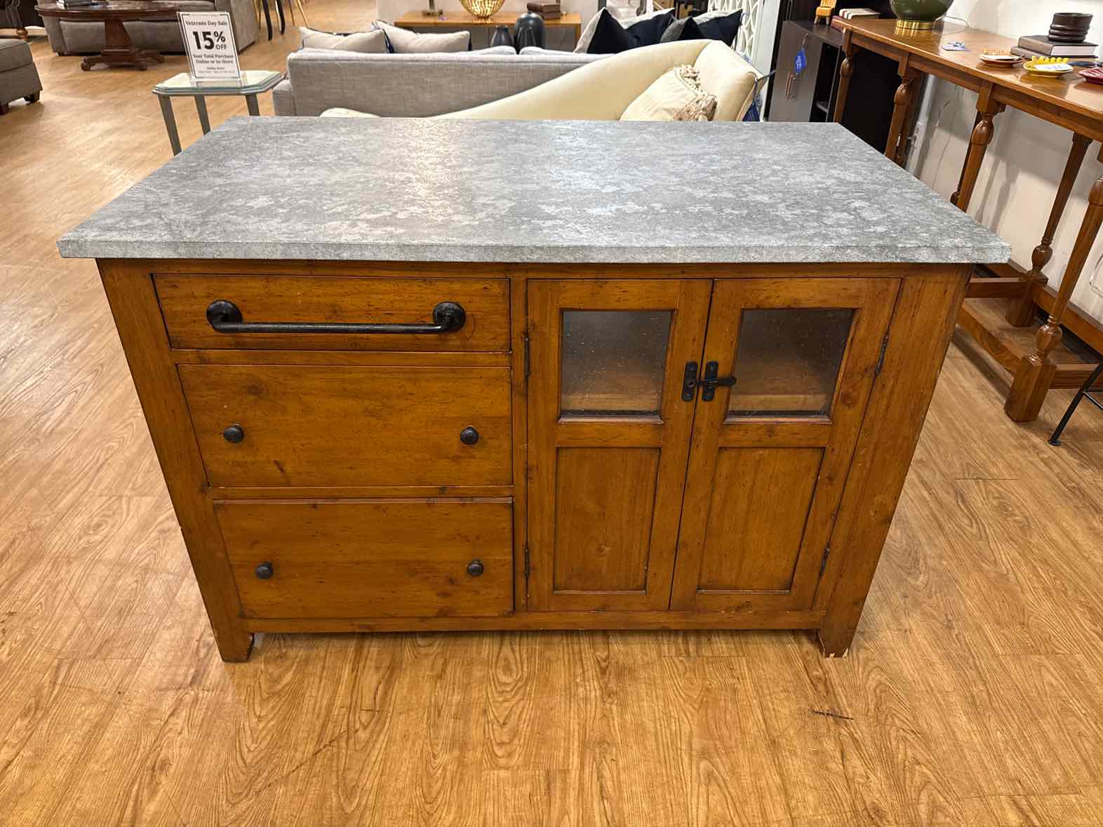 Distressed pine kitchen island with stone top, seeded glass cabinet doors and 2 interior shelves, 3 drawers
