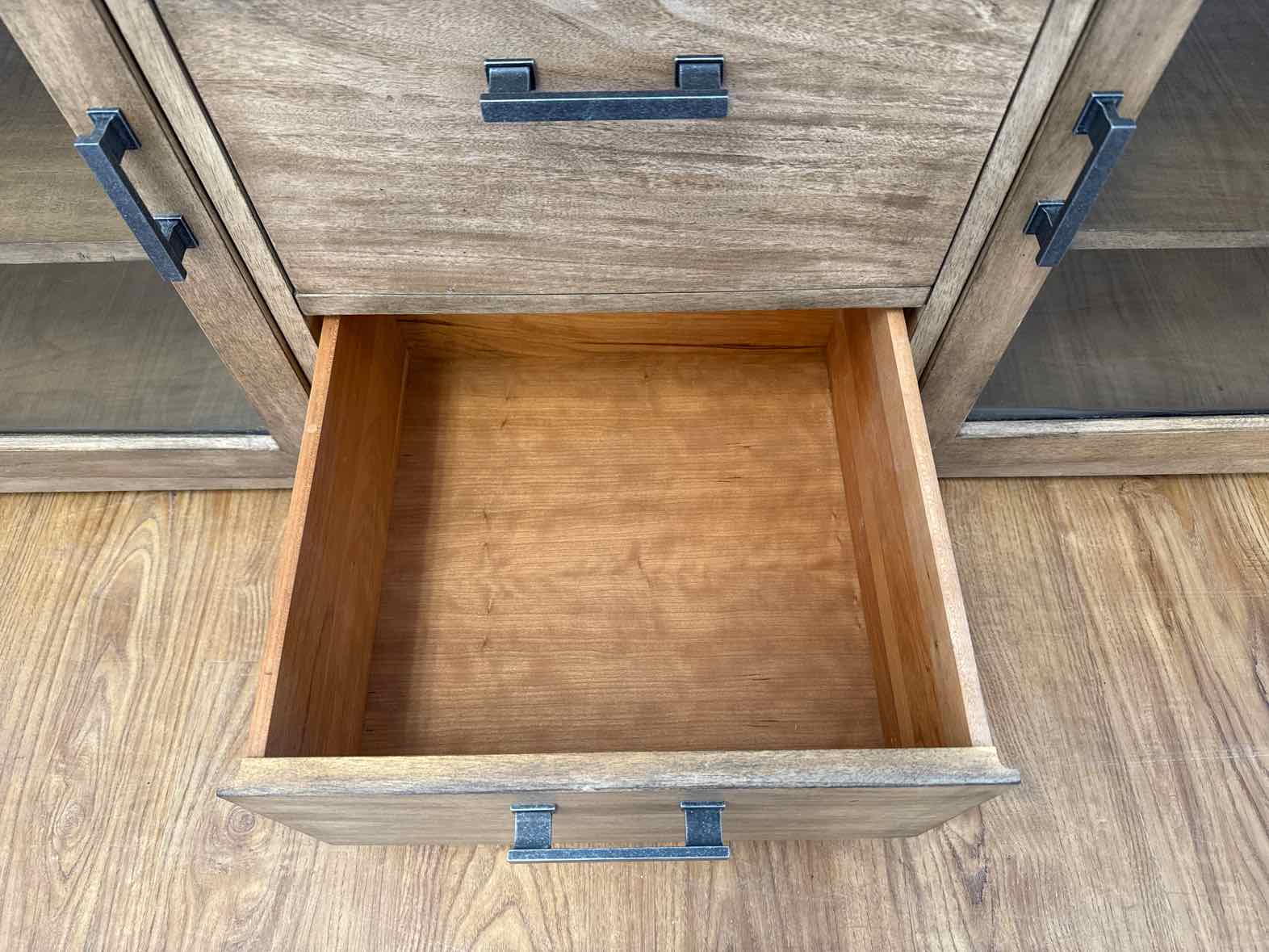 3-Drawer media console with dovetailed drawers, 2 glass-front cabinets w/ 4 adjustable shelves, wire management