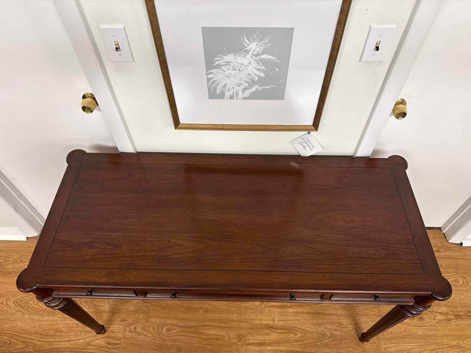 Entryway table in Antique Mahogany finish with 3 drawers & round tapered legs