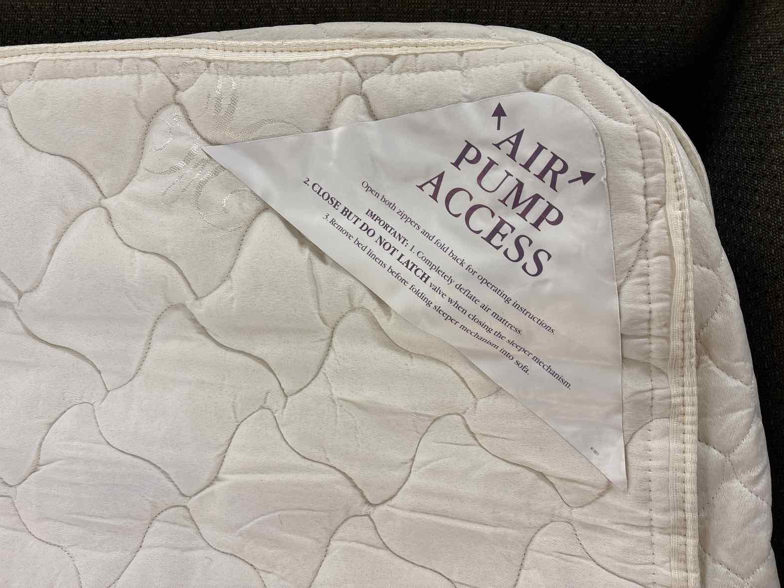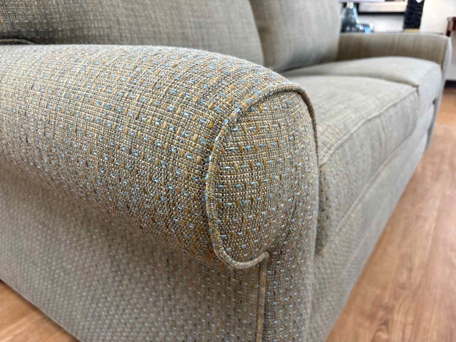 'Bennett' full sleeper sofa with rolled arm in sage, flax, and blue tweed, inflatable air mattress