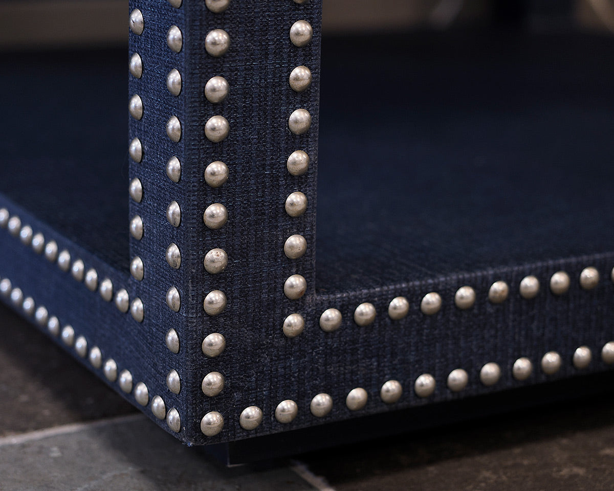 Navy Blue Wrapped Accent Table With Nickel Nail Head Trim.