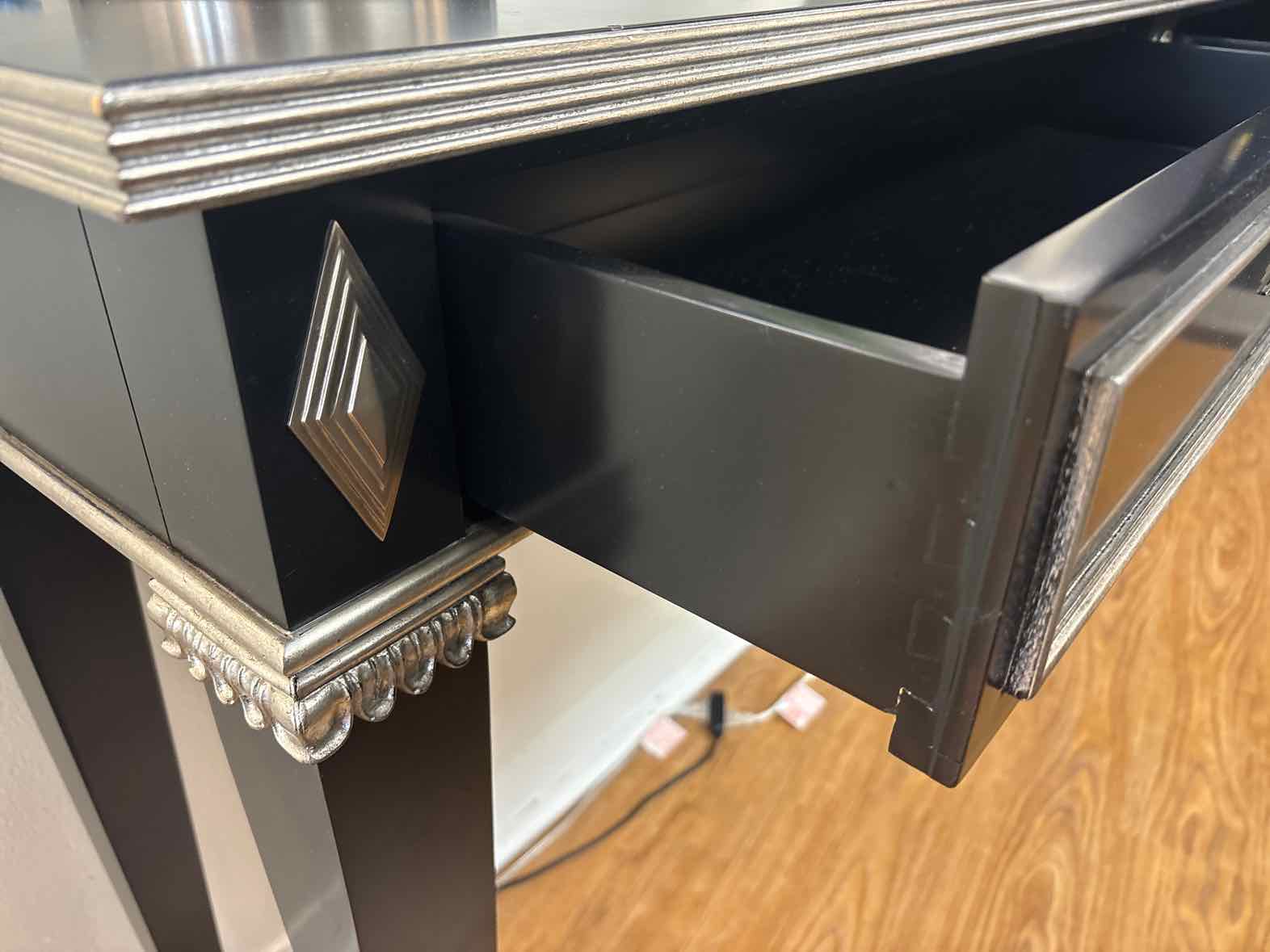 'Hempstead' 2-drawer console with dovetailed drawers, black finish with silver metallic accents