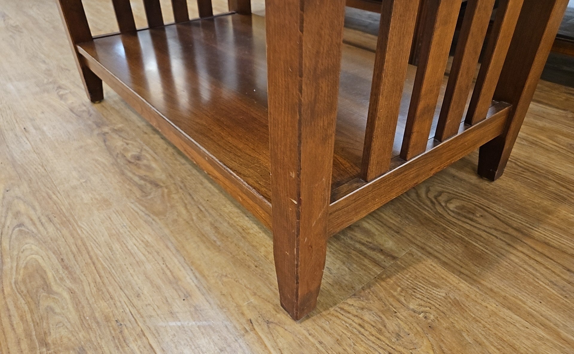 Mission style cherry cocktail table with slated sides and gallery shelf