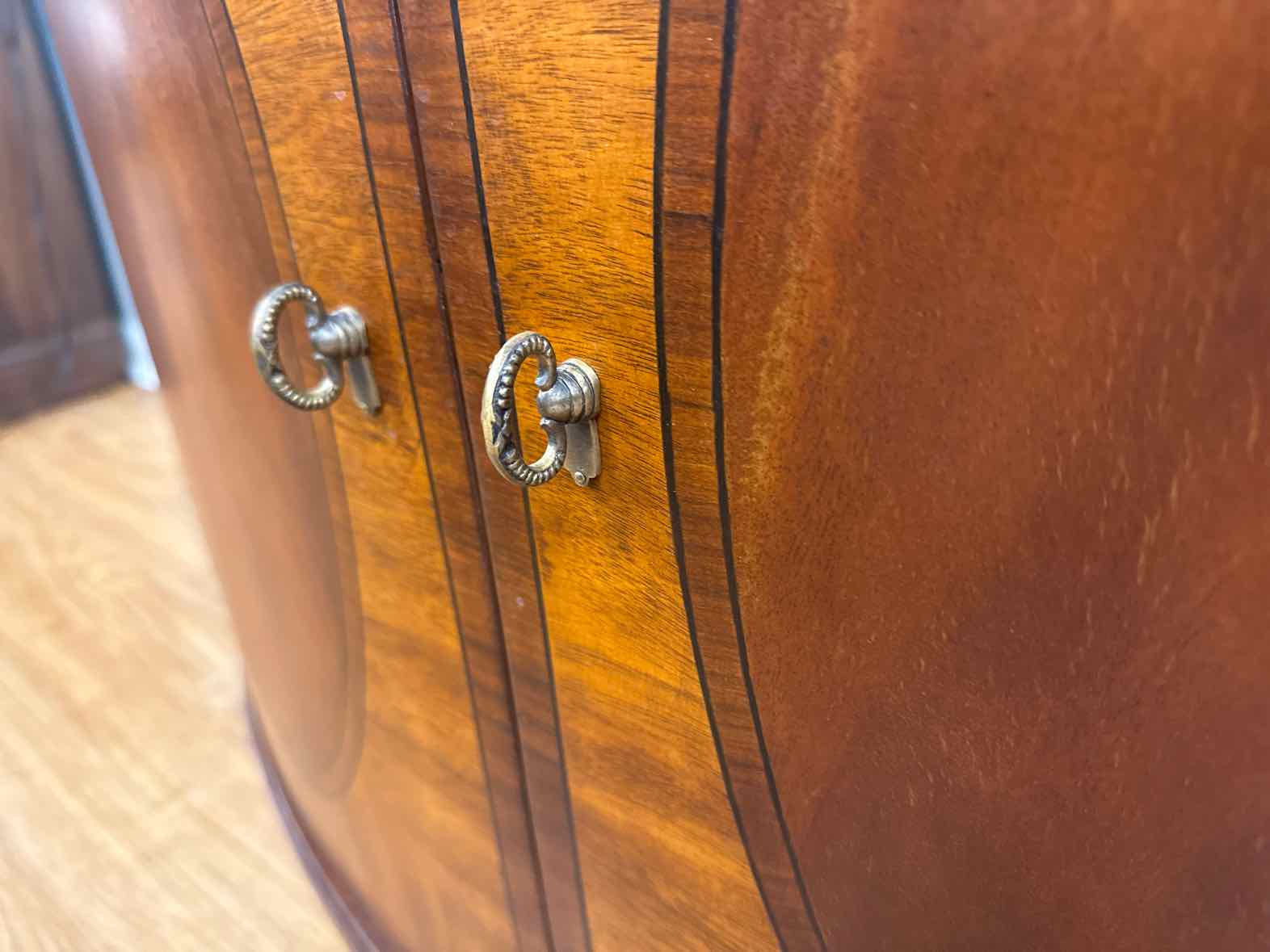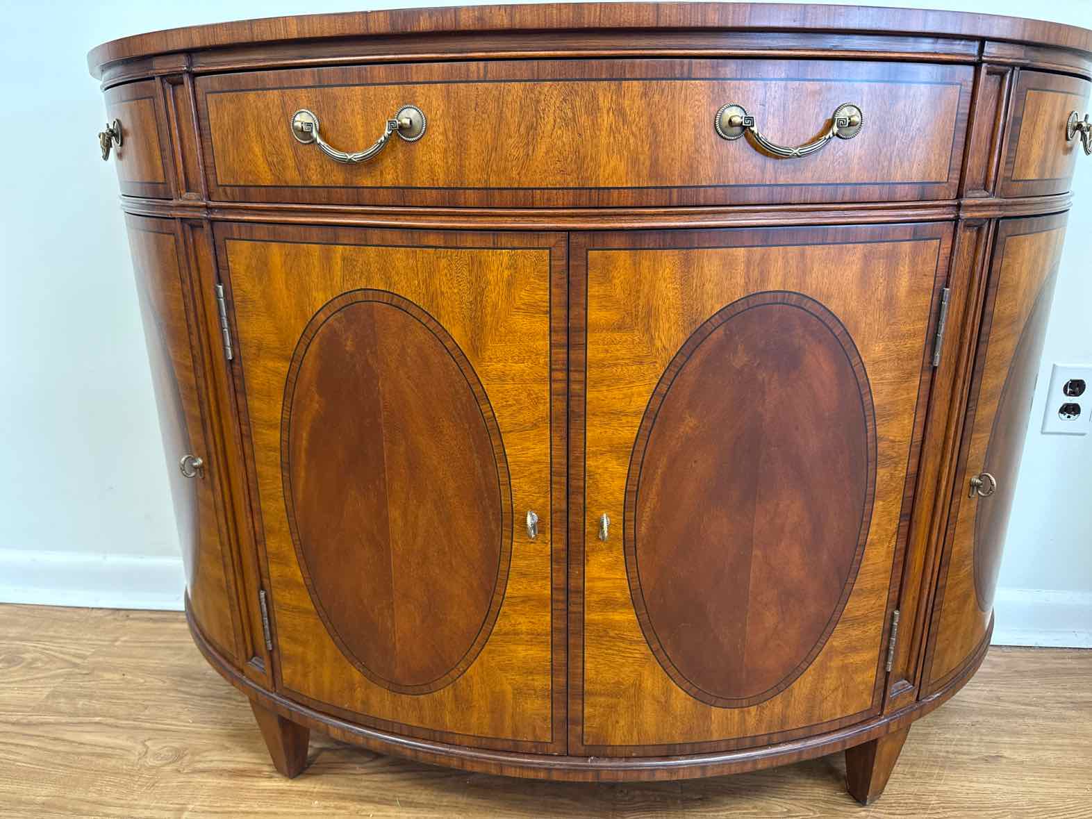 Regency-style demi lune mahogany server with inlaid satinwood, 3 drawers and 3 cabinets, brass hardware