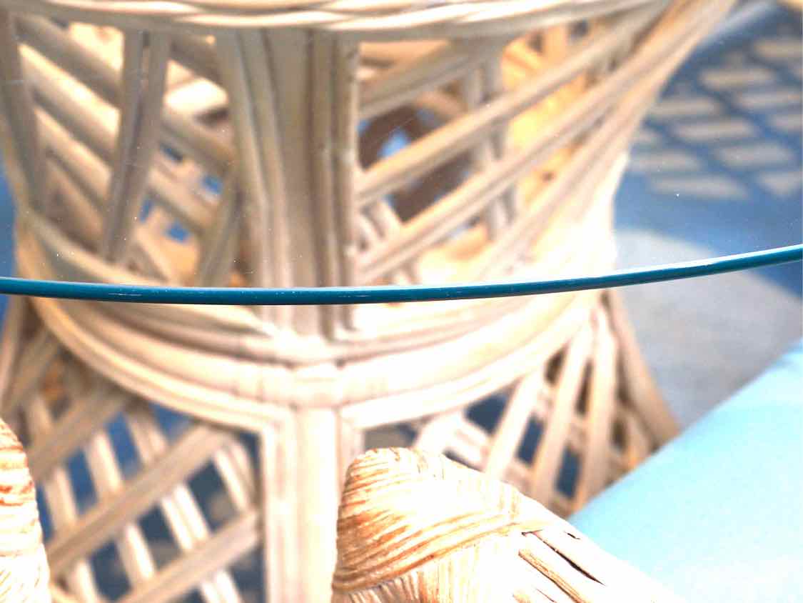 Fort Smith Chair Co. Round Glass Top Natural Wicker Base & 4 Cushion Chairs