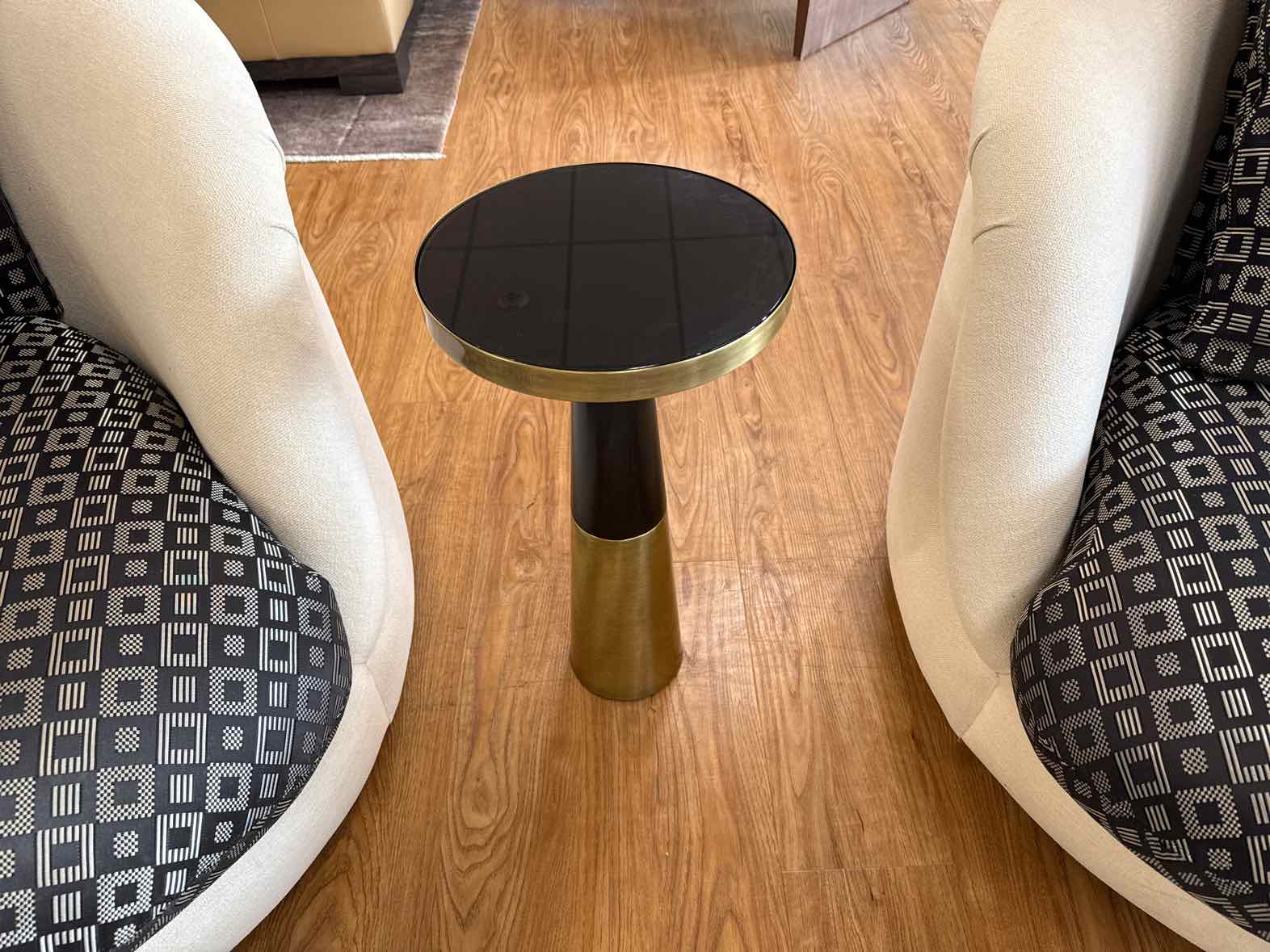 'Fortier' accent table with black glass top, tapered wooden base in dark espresso w/ brushed brass details