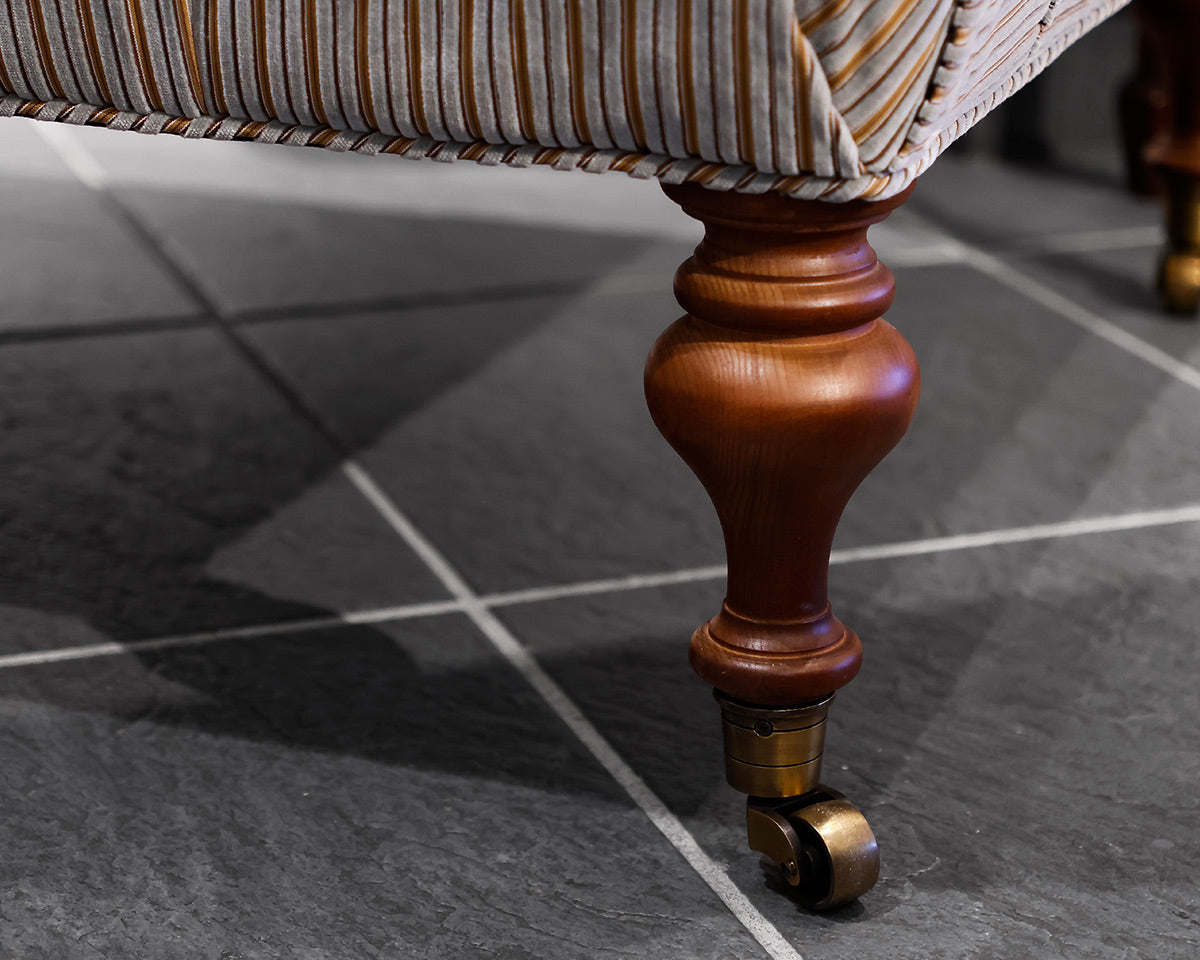 Tufted ottoman w/ fruitwood turned legs and brass casters. slate blue and mustard striped cut velvet upholstery.