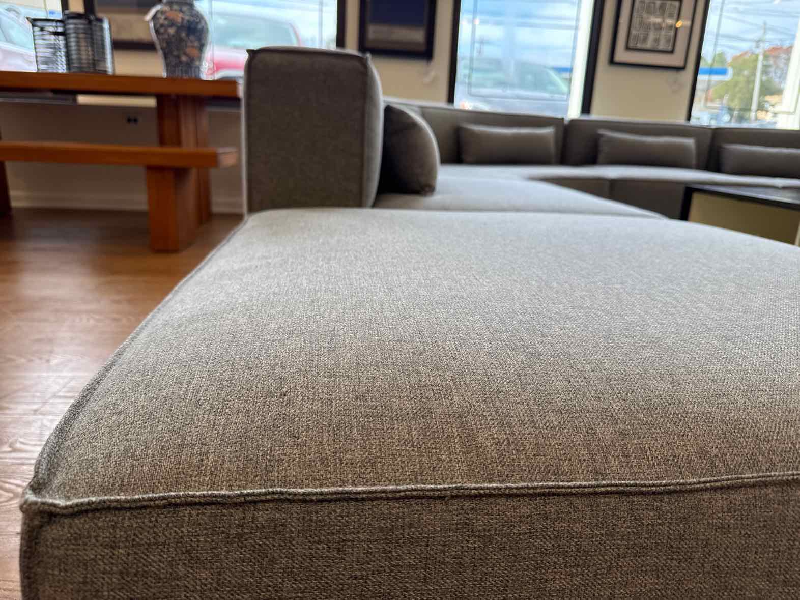 Modular contemporary U-shaped gray sectional with track arm, matching ottoman & five lumbar pillows