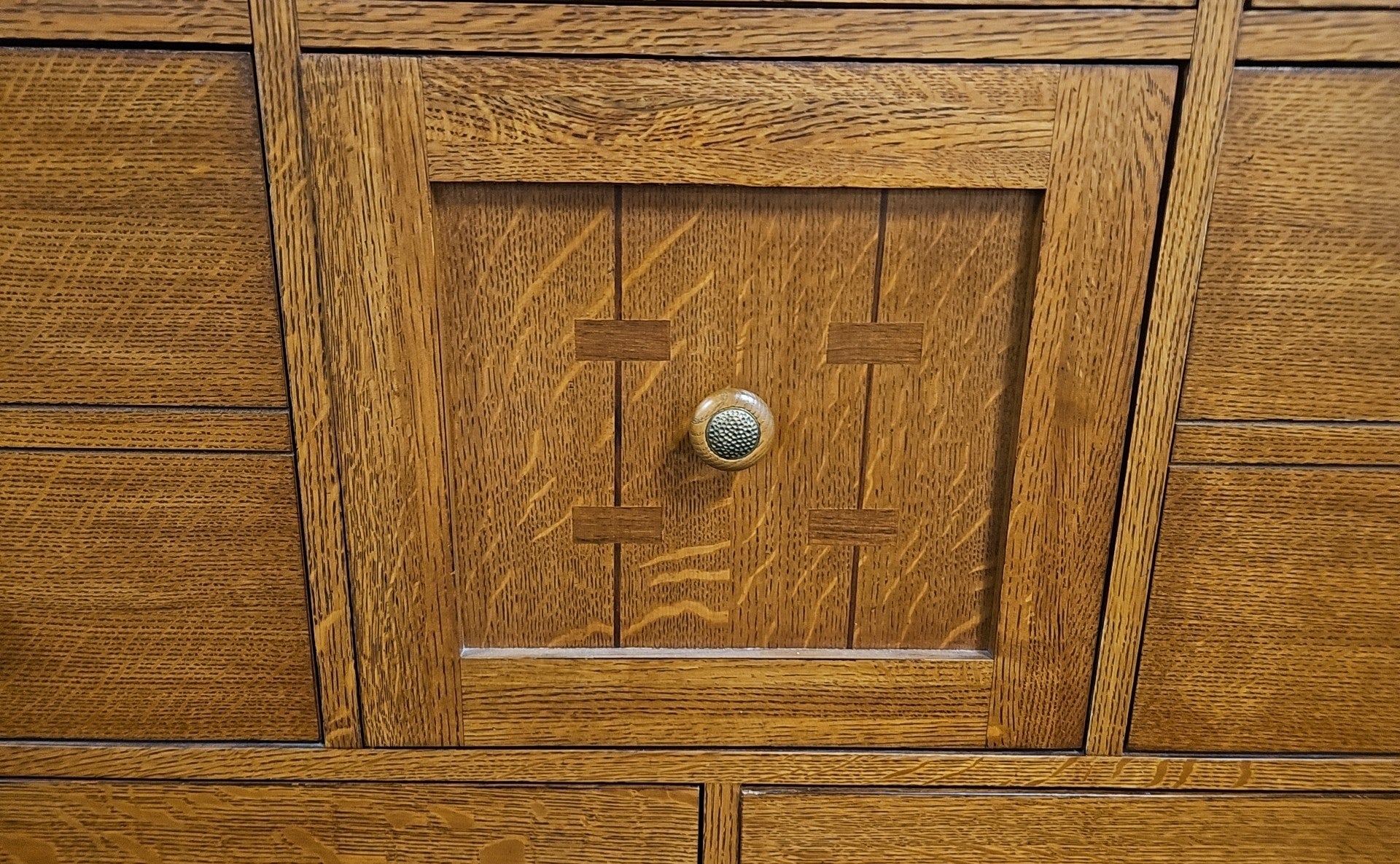 Mission-style oak 10-drawer dresser, stamped brass knobs, detailing on sides (some scratching on top)