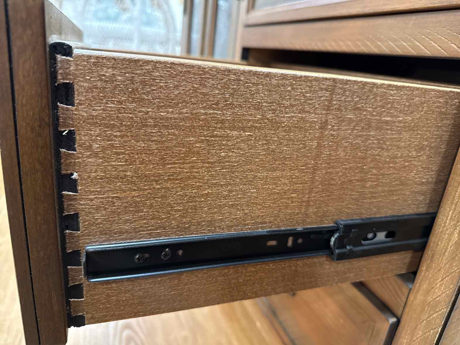 Industrial rustic 3-drawer sideboard with distressed wood, 2 seeded glass cabinets w/ interior shelves, on casters