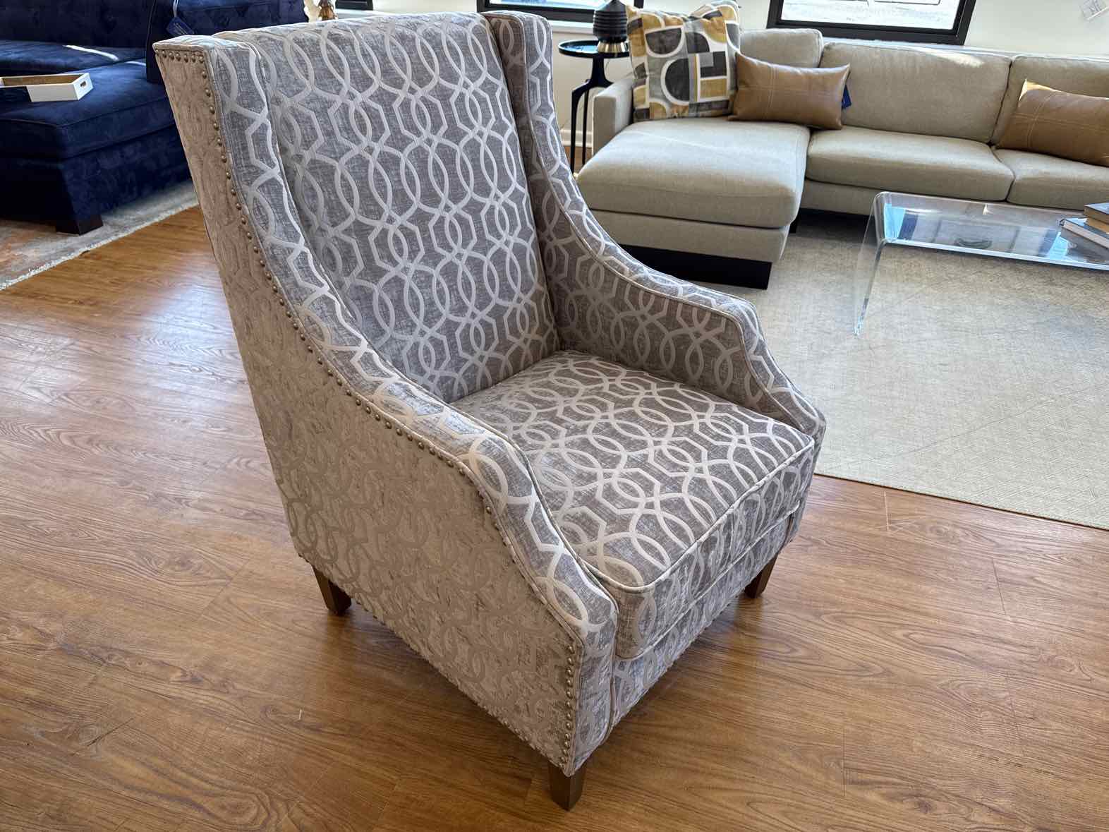 Pair of 'Quinn' wing chairs in geometric grey & silver fabric, nailhead trim and espresso foot