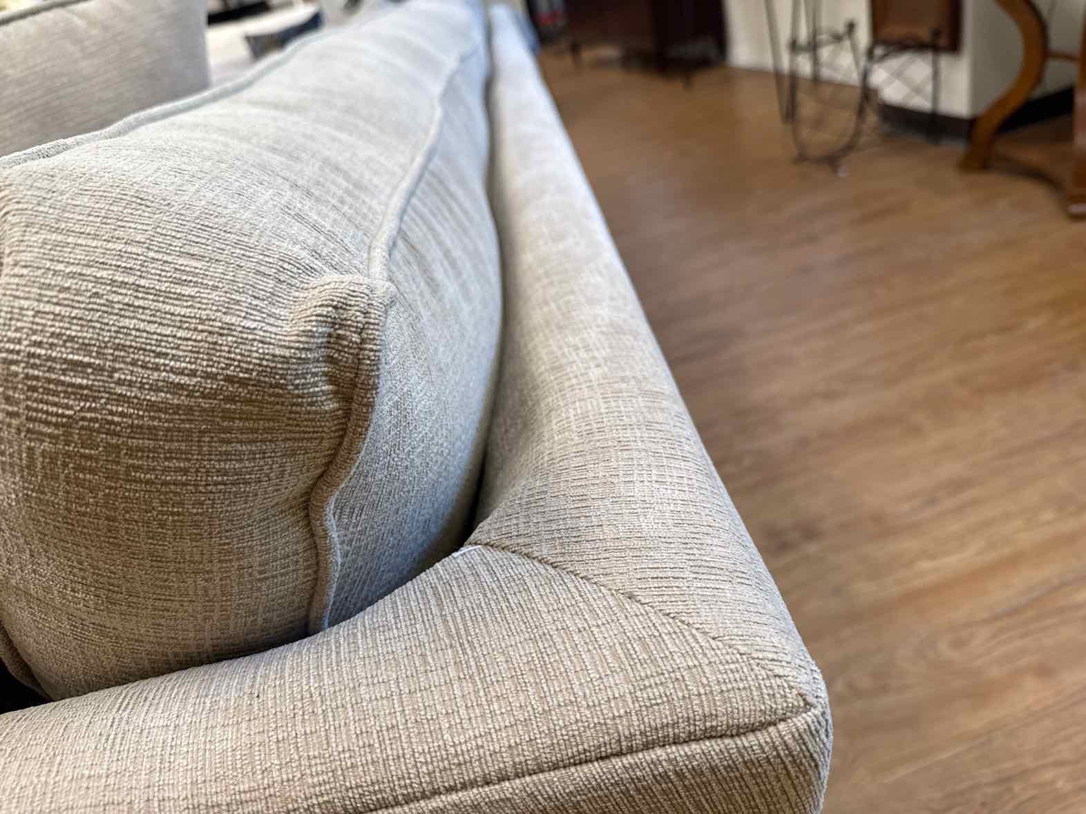 Five piece corner modular sectional in oatmeal colored performance fabric w/ track arms and espresso feet