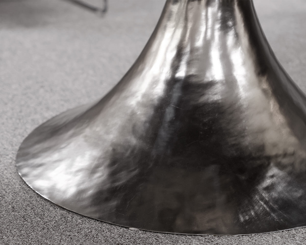 Oval Wood Top Dining Table With Hammered Nickel Pedestal Base. Custom Glass Cut Top.