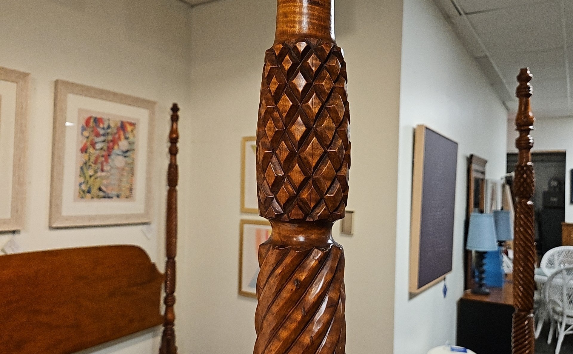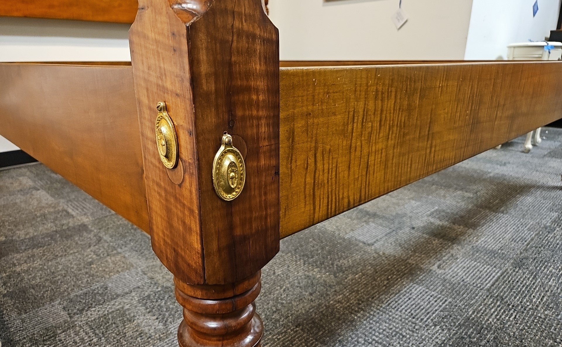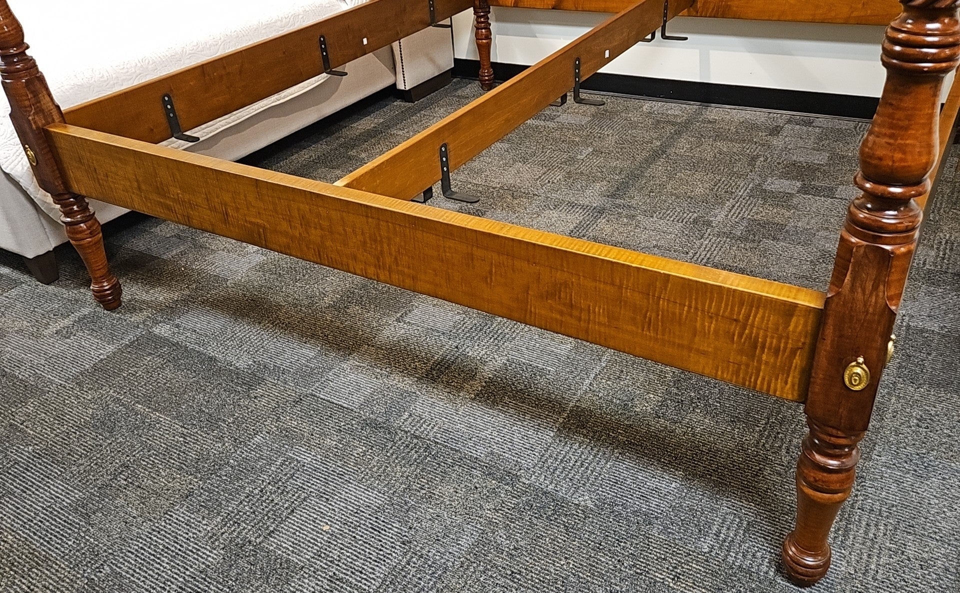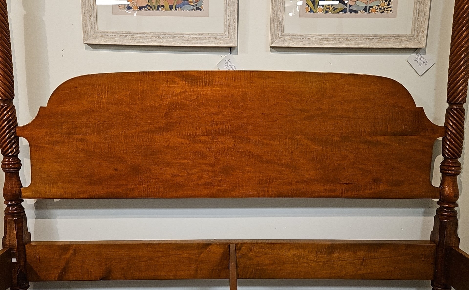 Tiger maple tall post 4-poster king bed, carved rope detailing, brass post bolt covers