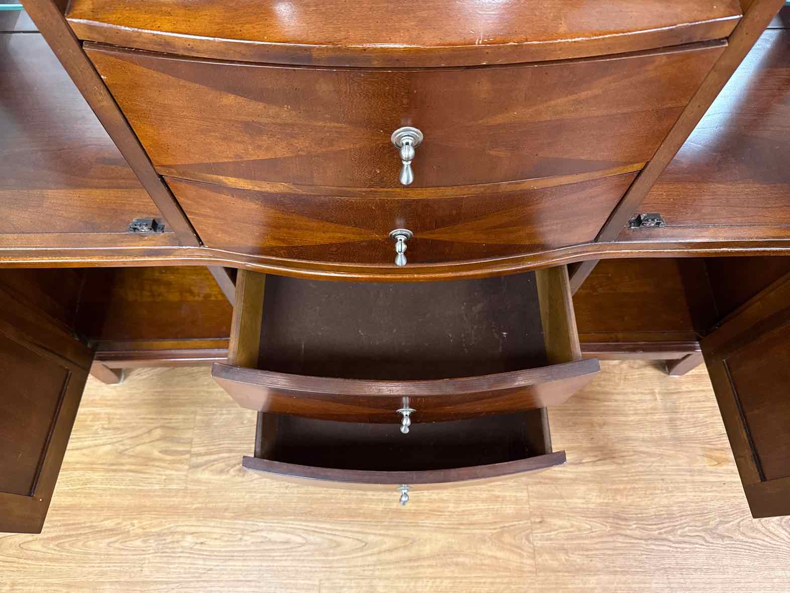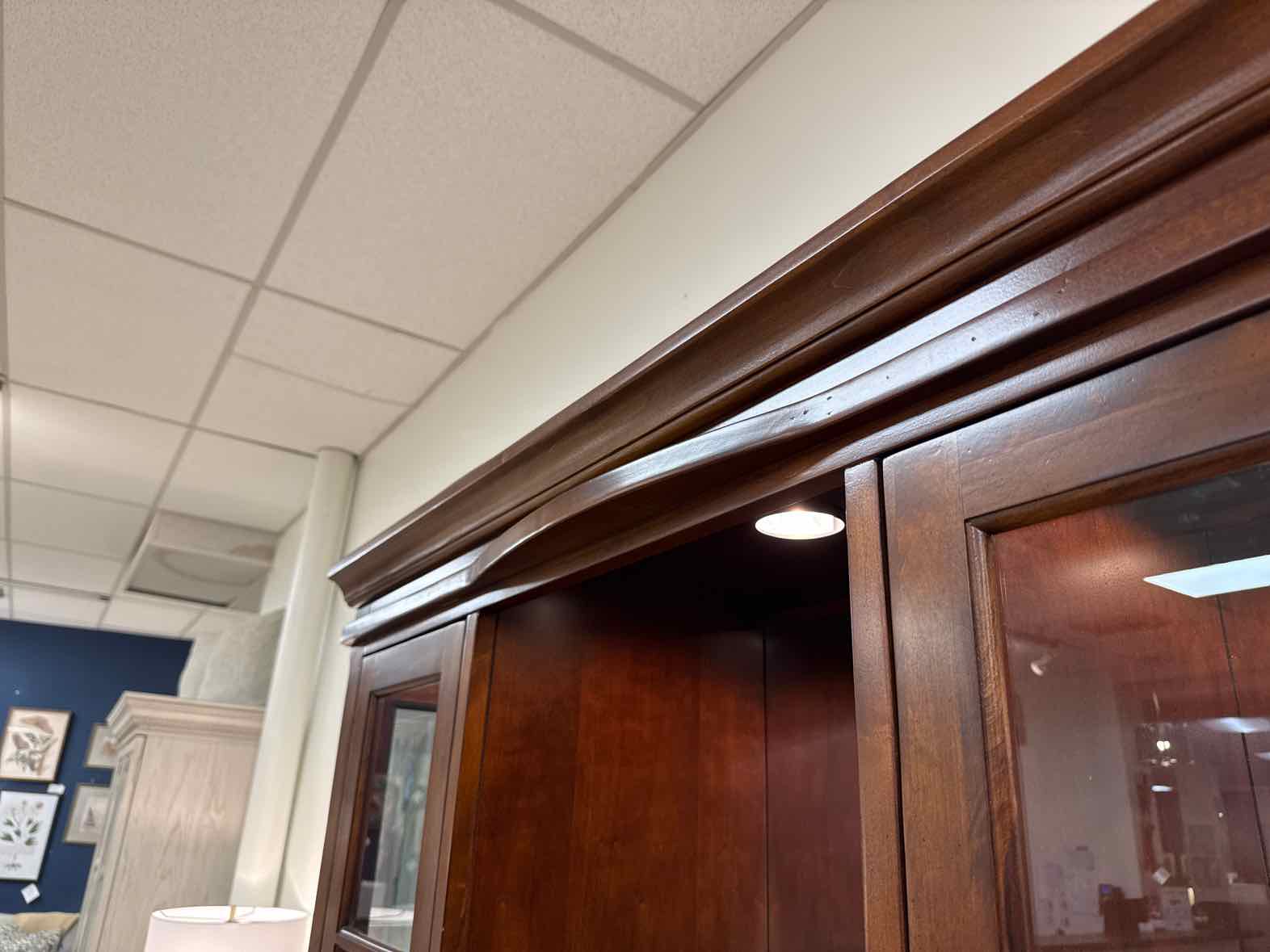 4 drawer lighted cherry china cabinet, mirrored back with center glass display shelves, 3 glass shelves on sides