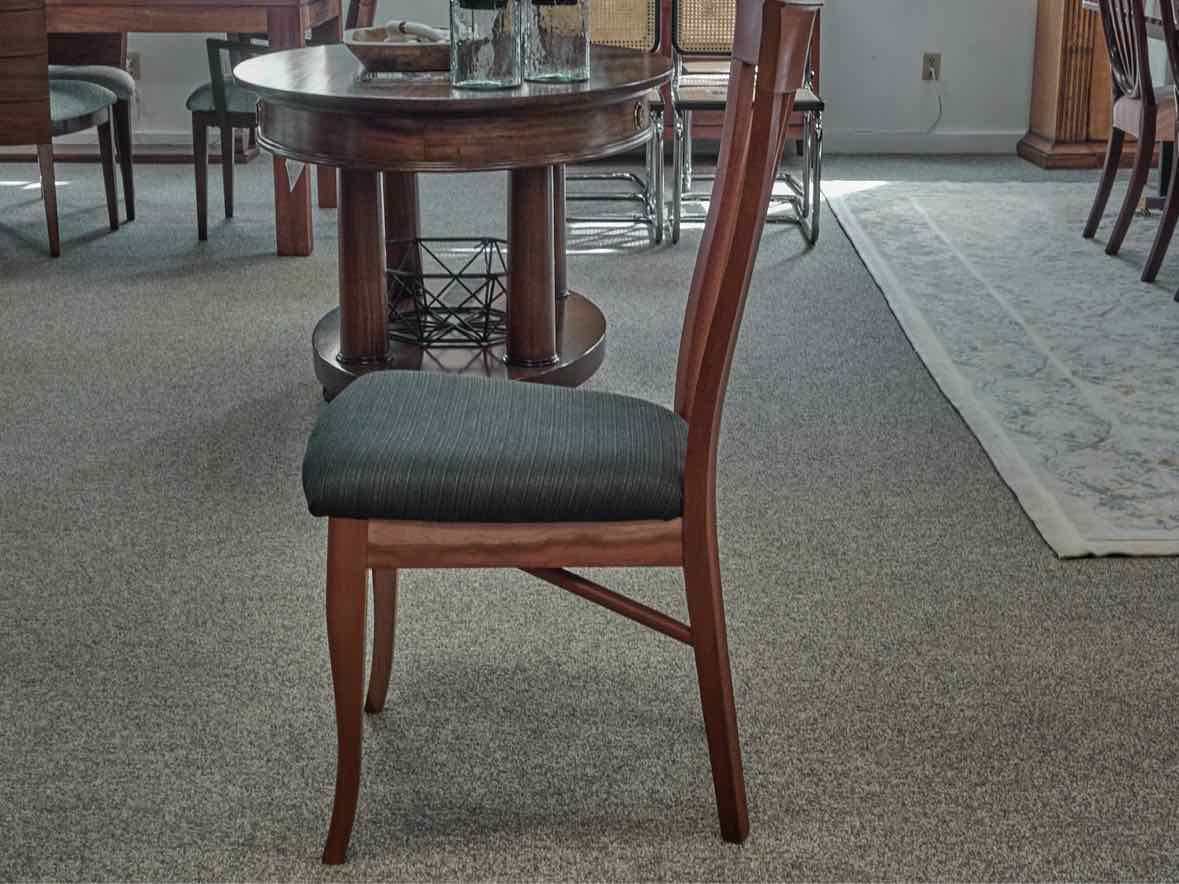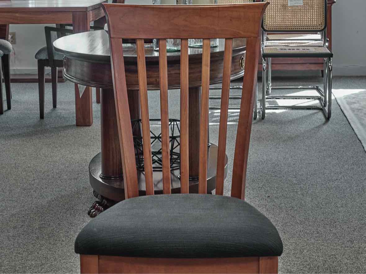 Classic Shaker flare leg solid top dining table in natural cherry with set of 4 matching chairs with black seats