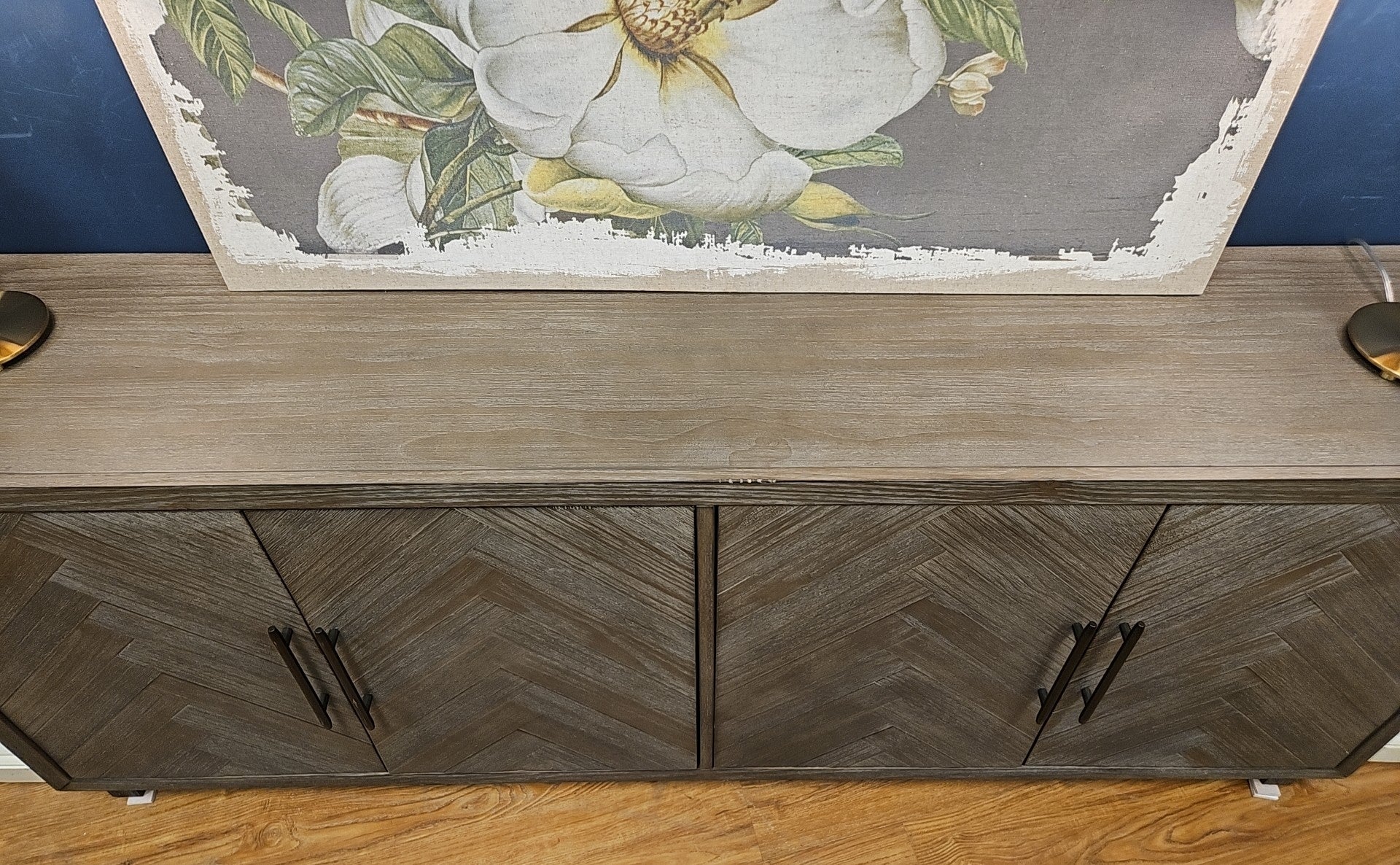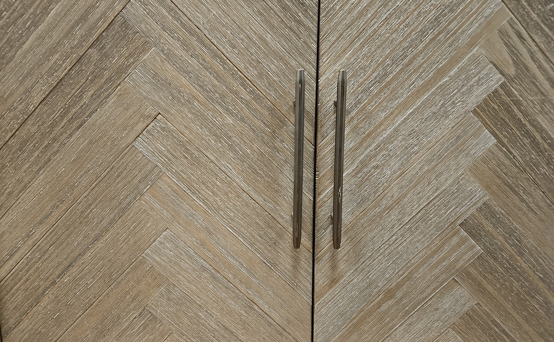 'Palisades' 4-door console w/ 2 adjustable shelves in brushed grey, herringbone door fronts, iron hardware