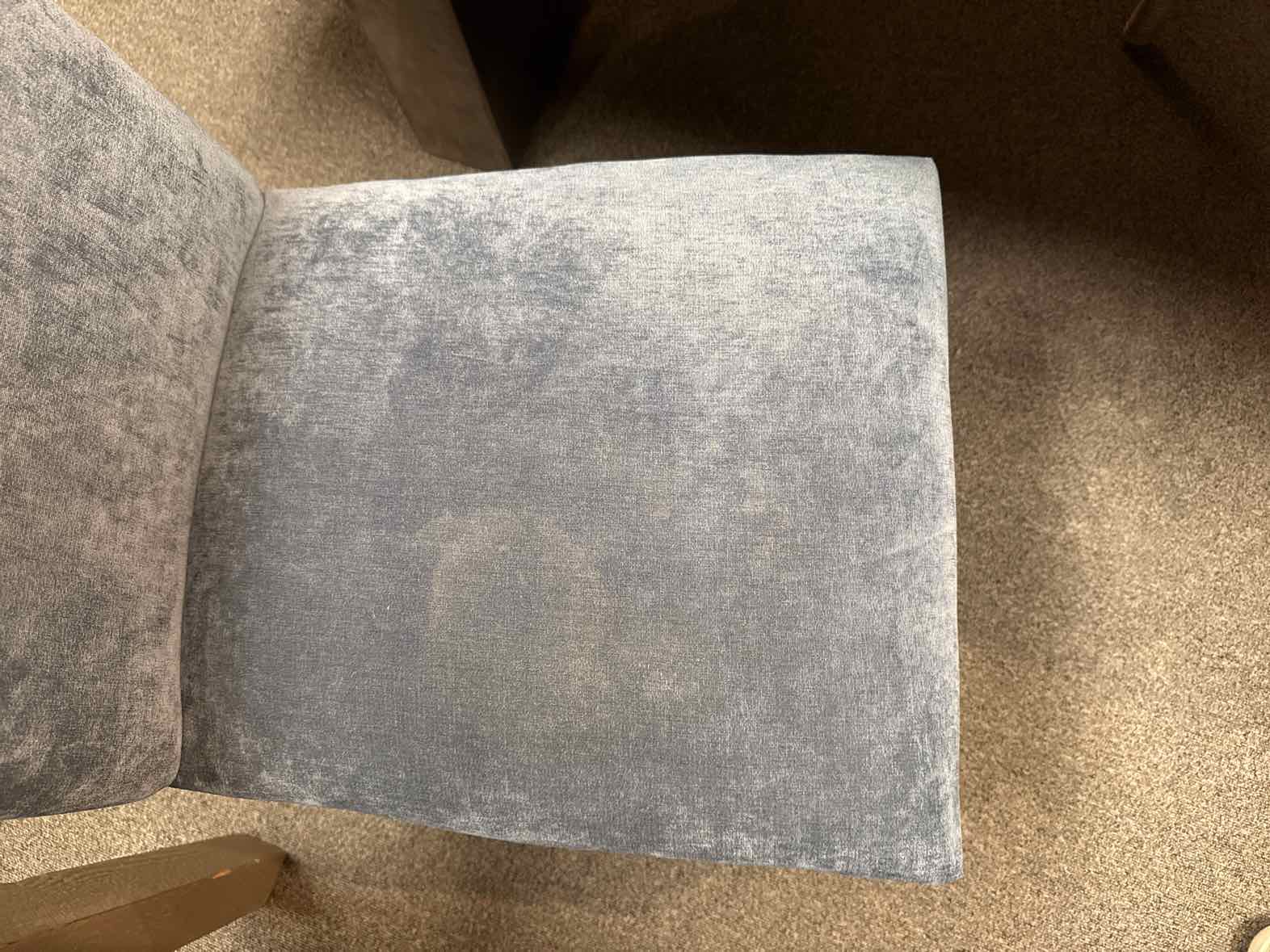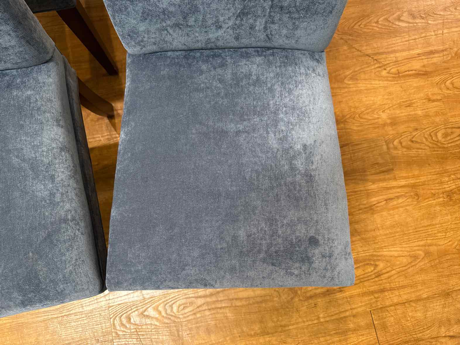 Set of 10 smoky blue velvet slipper dining chairs, espresso feet are lightly distressed