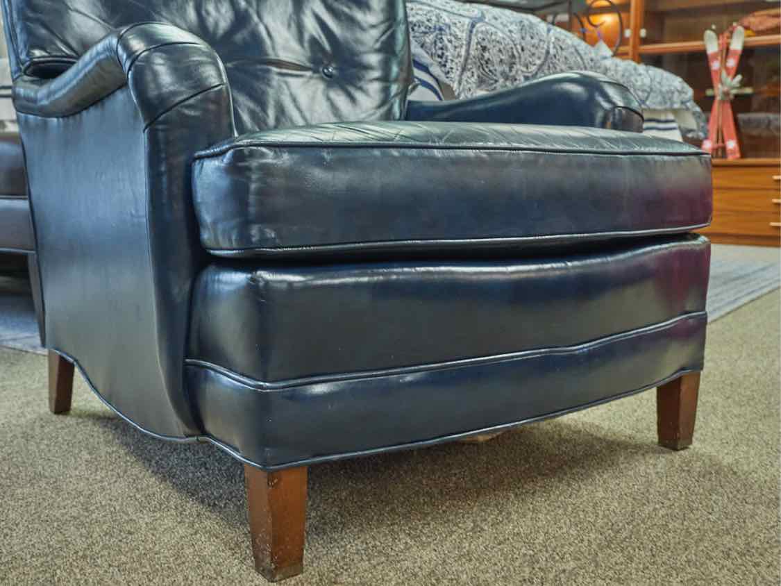 Blue Leather English Arm Chair w/ Button Back & Brass Nail Head Ottoman