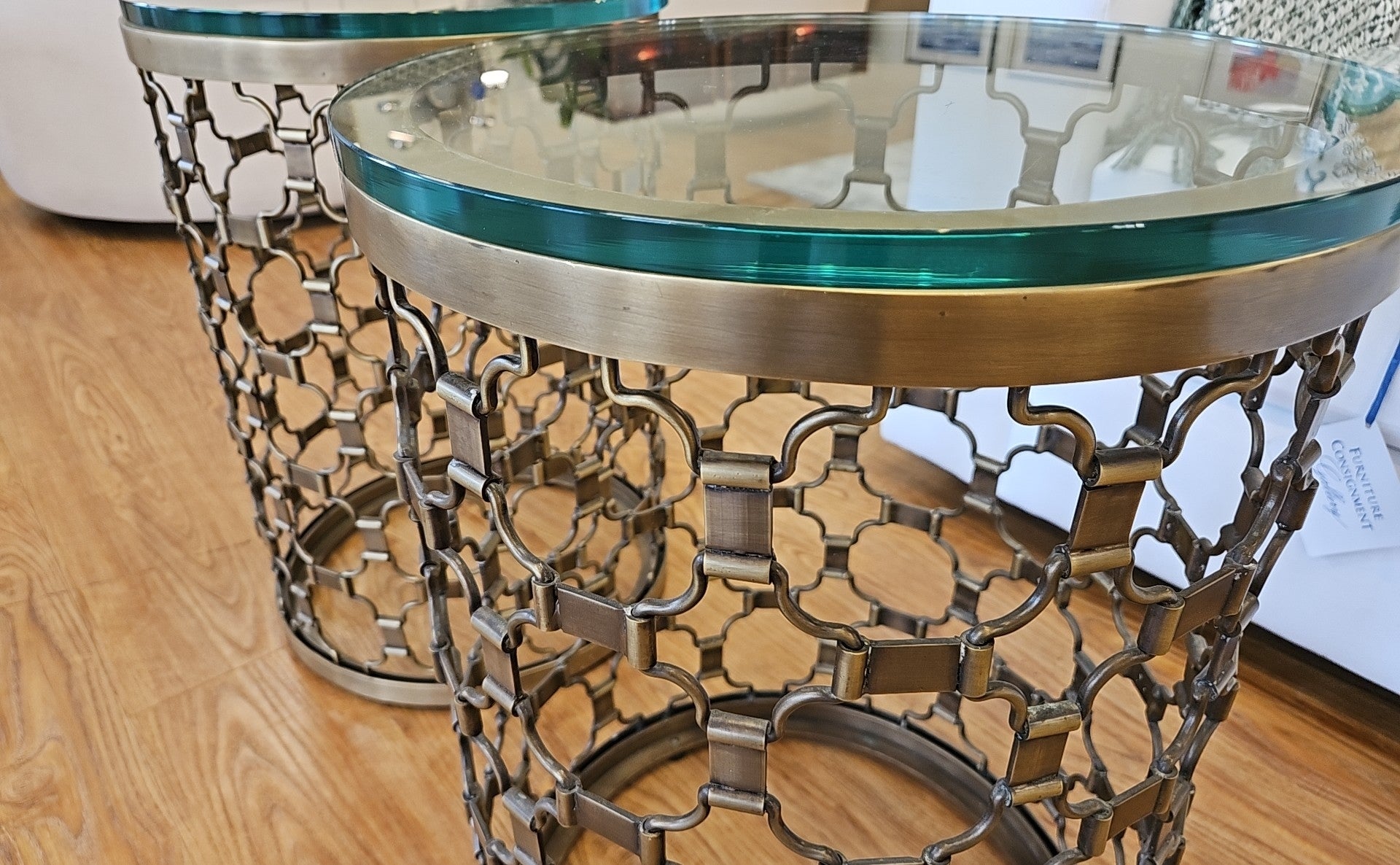 Pair of Arhaus round glass top side tables, with metal geometric base