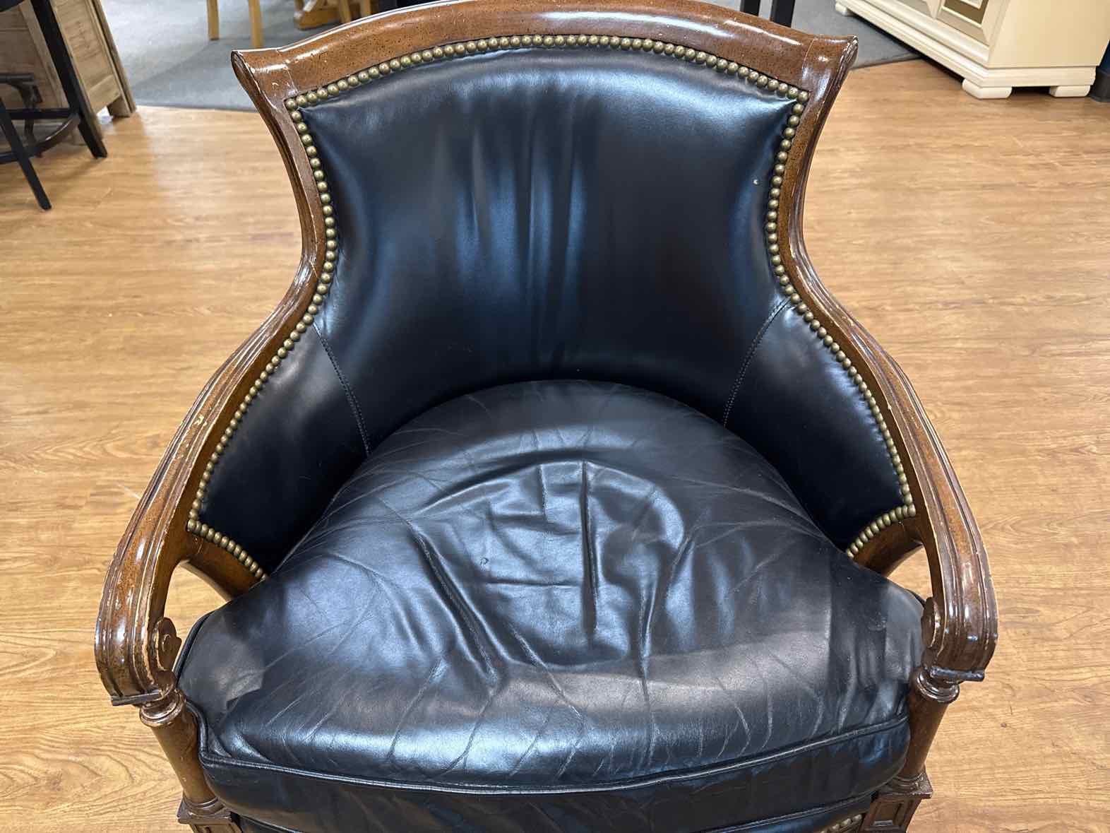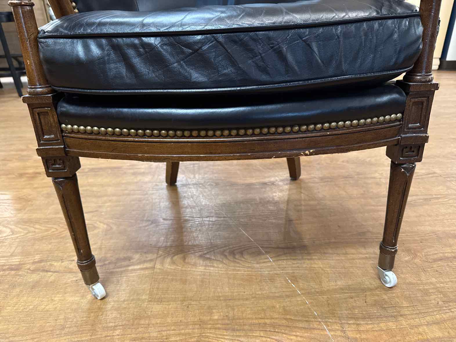 Pair of black leather chairs with scrolled arm, brass nail trim and casters (finish is rubbed off in places)