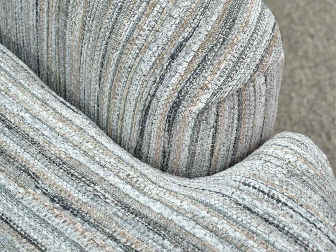 Pair of "Sofia" swivel chairs in loft stripe with a pair of matching toss pillows
