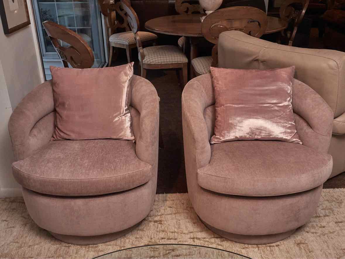 Pair of Milo Baughman Style 'Light PinK Shimmer' Tub Club Form Modern Swivel Chairs with Toss Pillows