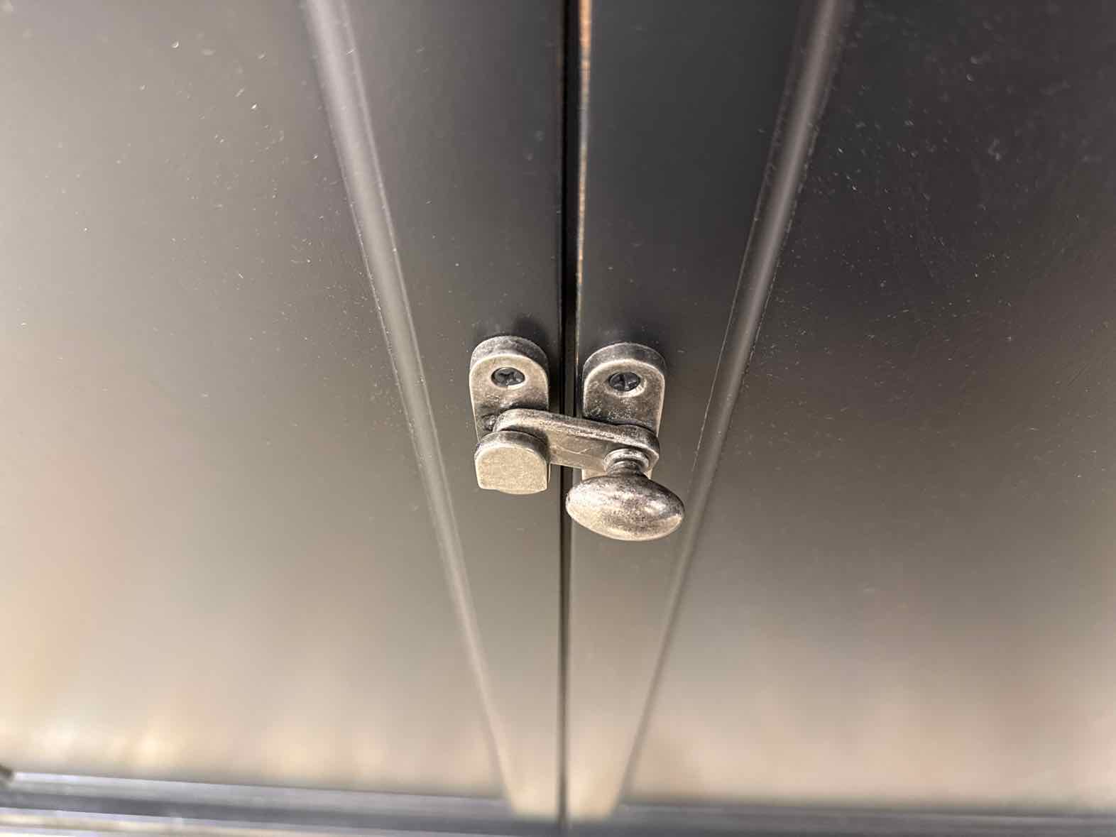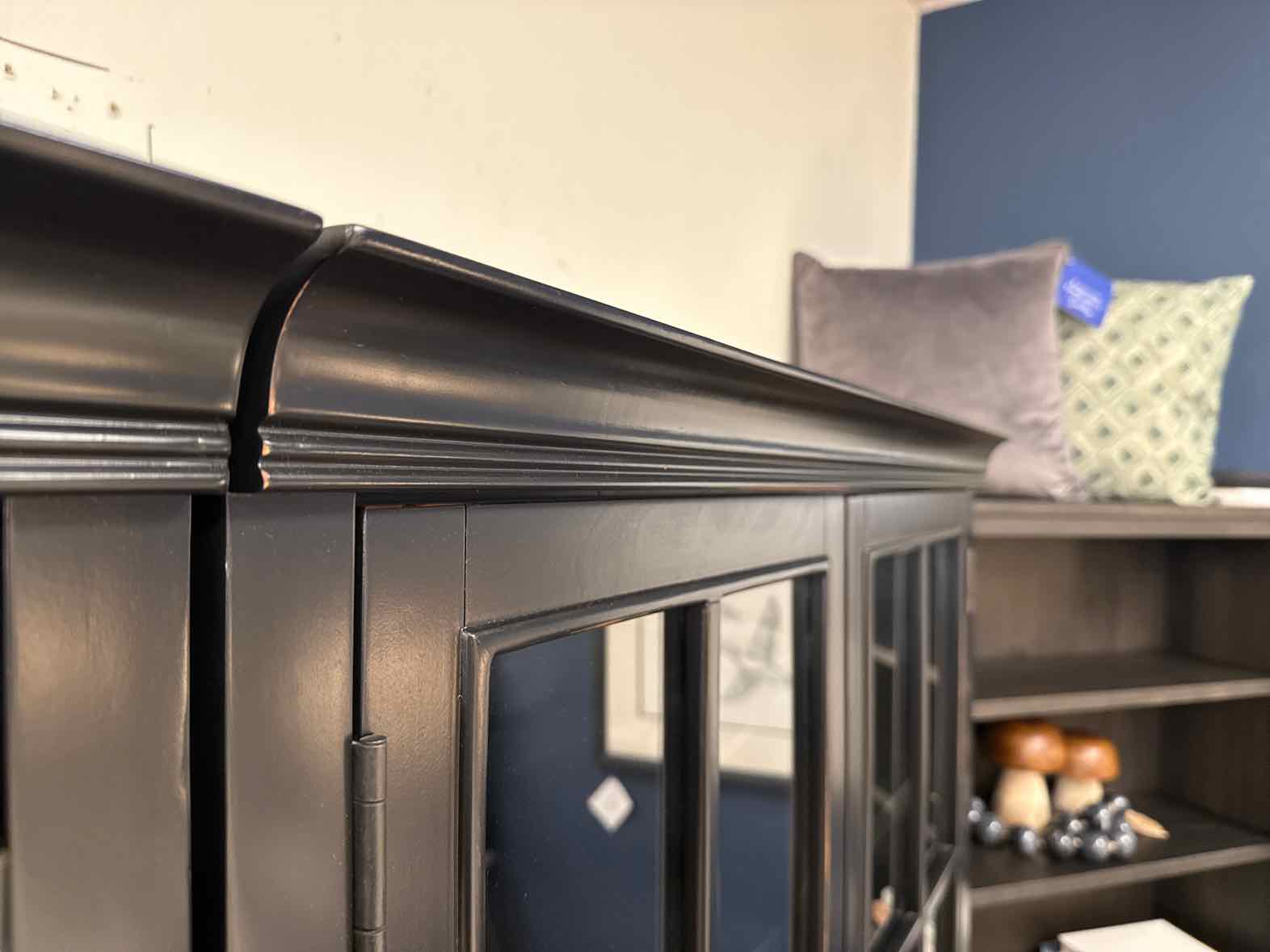 Black china cabinet with 2 glass doors, fixed and adjustable shelf, bottom cabinet with adjustable shelf