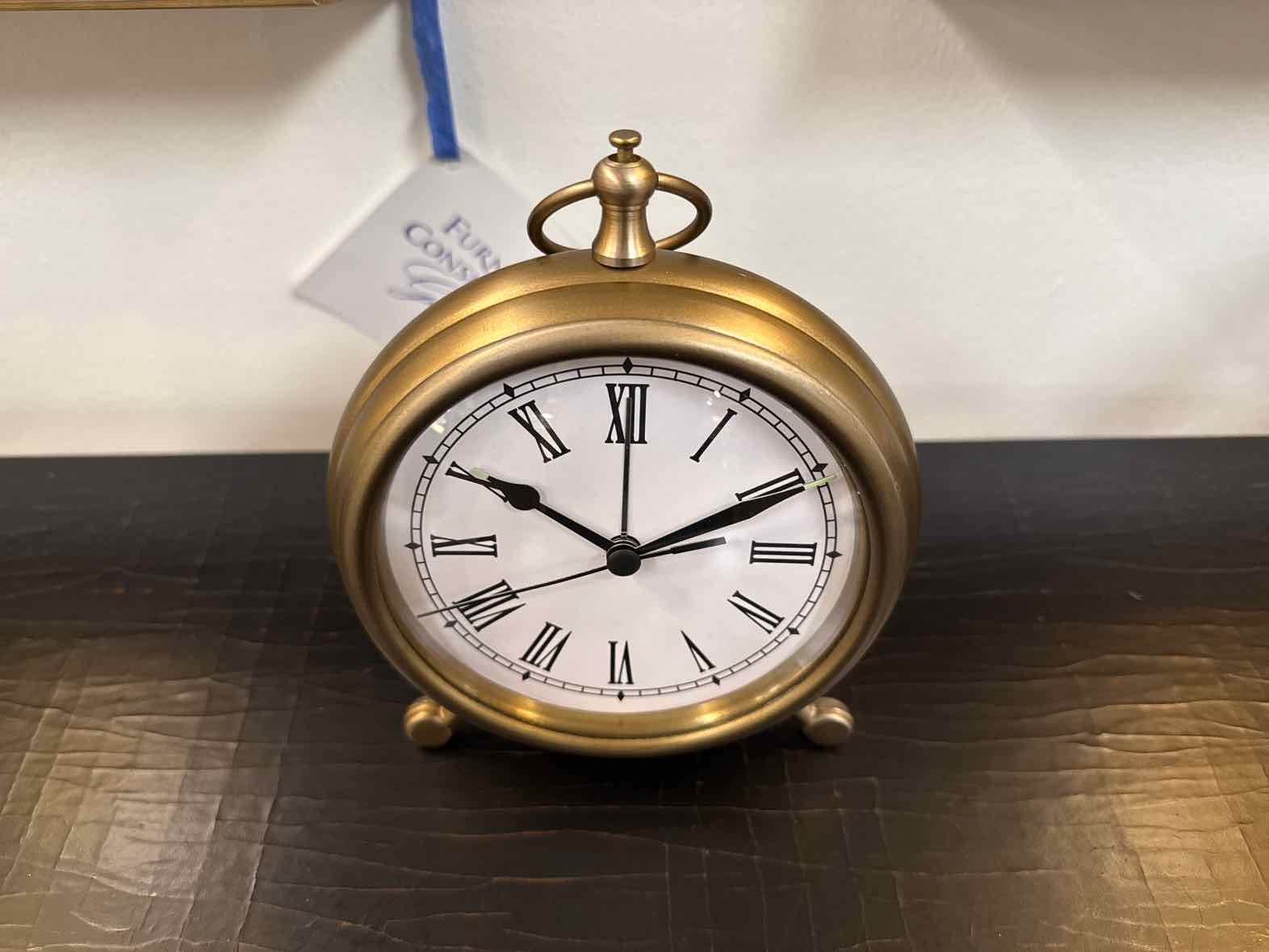 Antique English-style brass finish pocket watch desk clock with black roman numerals