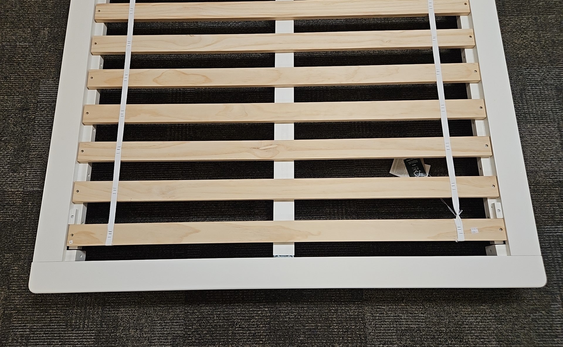 White lacquer queen platform bed, headboard has 2 sliding doors and cubby space (hb, fb, rails, slats)
