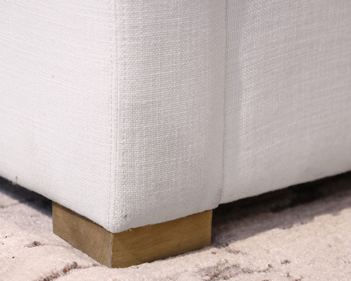 RH two-piece sectional in a white woven fabric with track arms. Down-blend back cushions and foam-filled bench seat cushions.