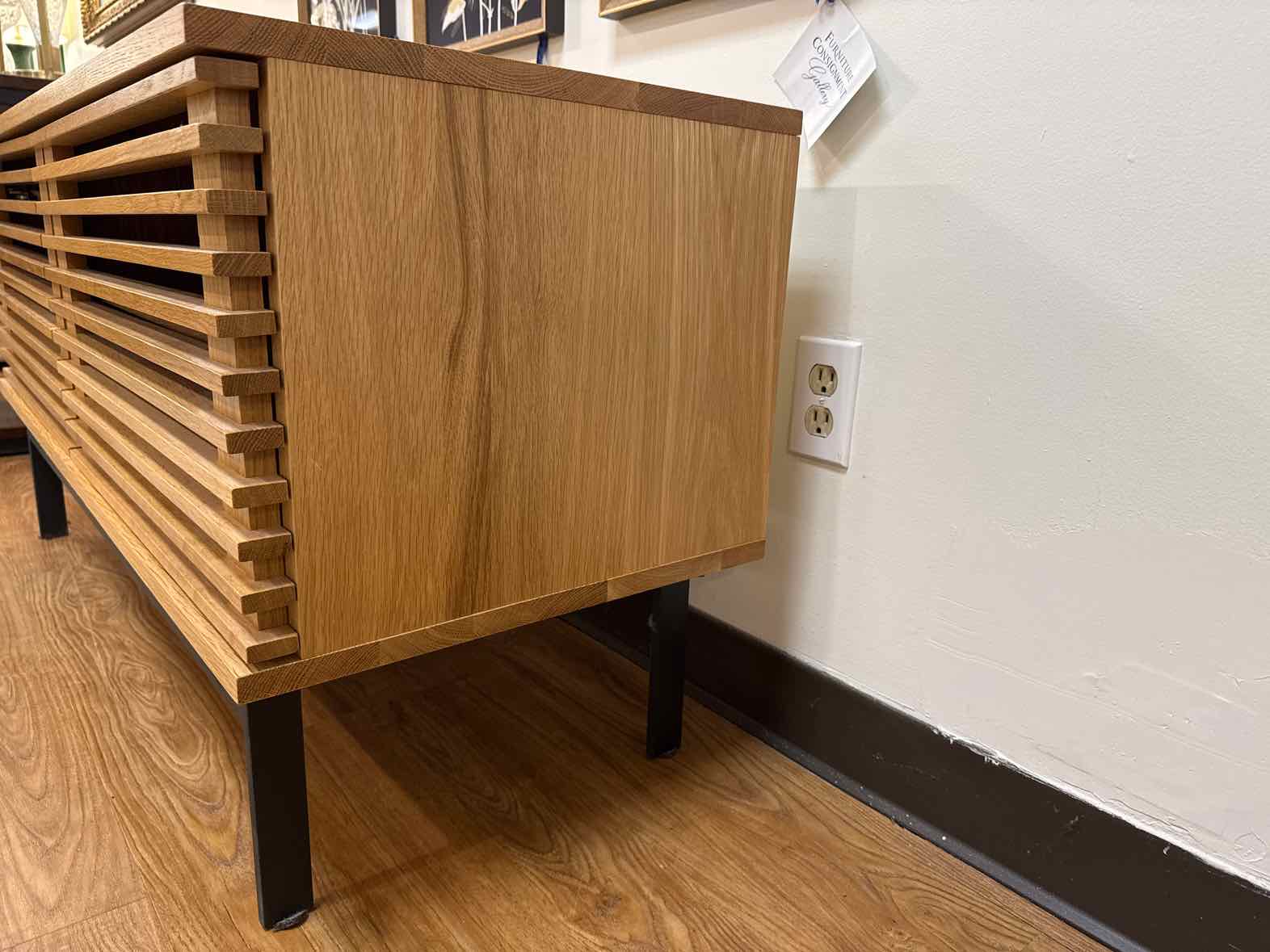 'Coles' 2-door media console with louvered doors in white oak with 2 adjustable shelves and steel base