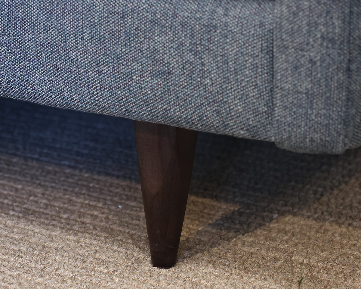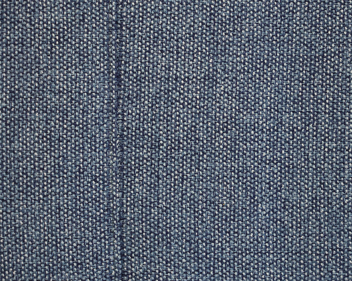 Room & Board day bed sofa. Steel blue color in a woven fabric. Two neck roll pillows on a bench cushion.