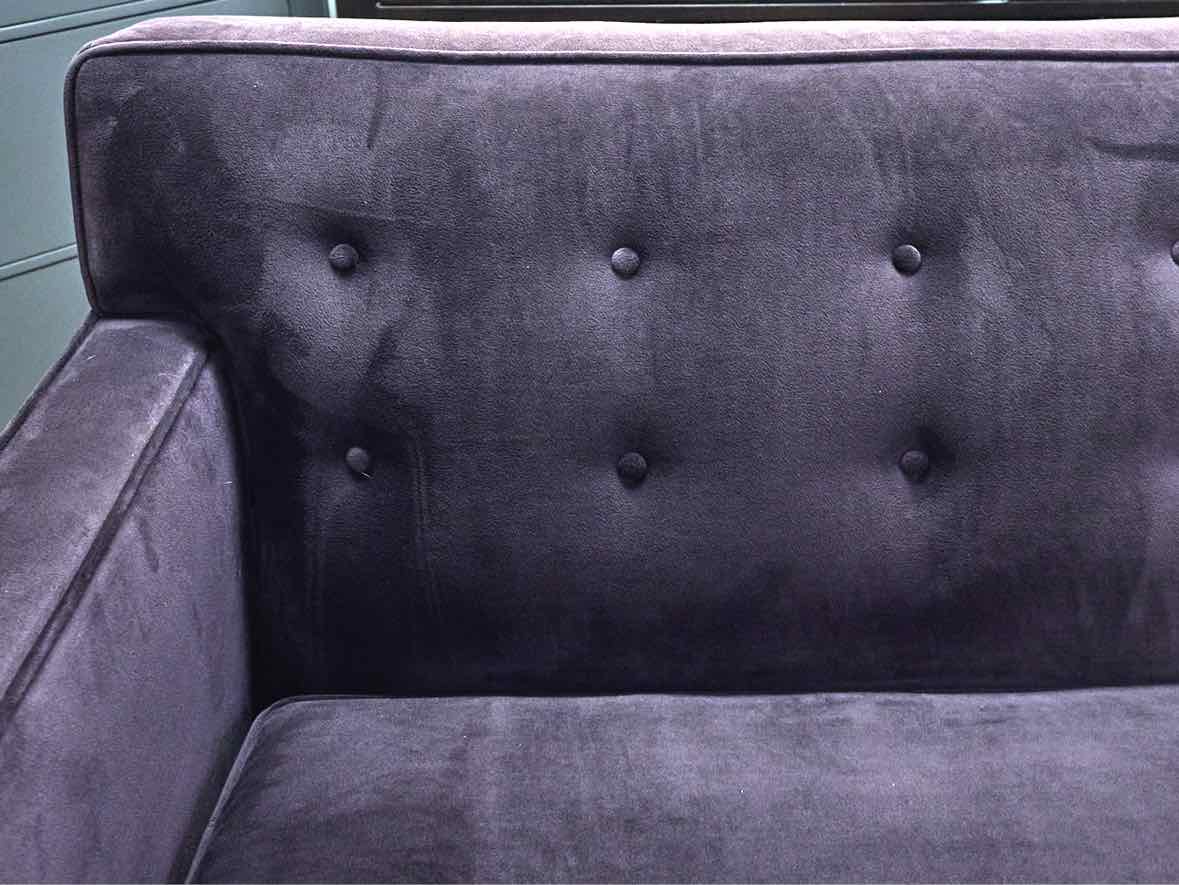 Mid-Century Tight Button-Back Eggplant Sofa w/Track Arms and Espresso Wood Legs