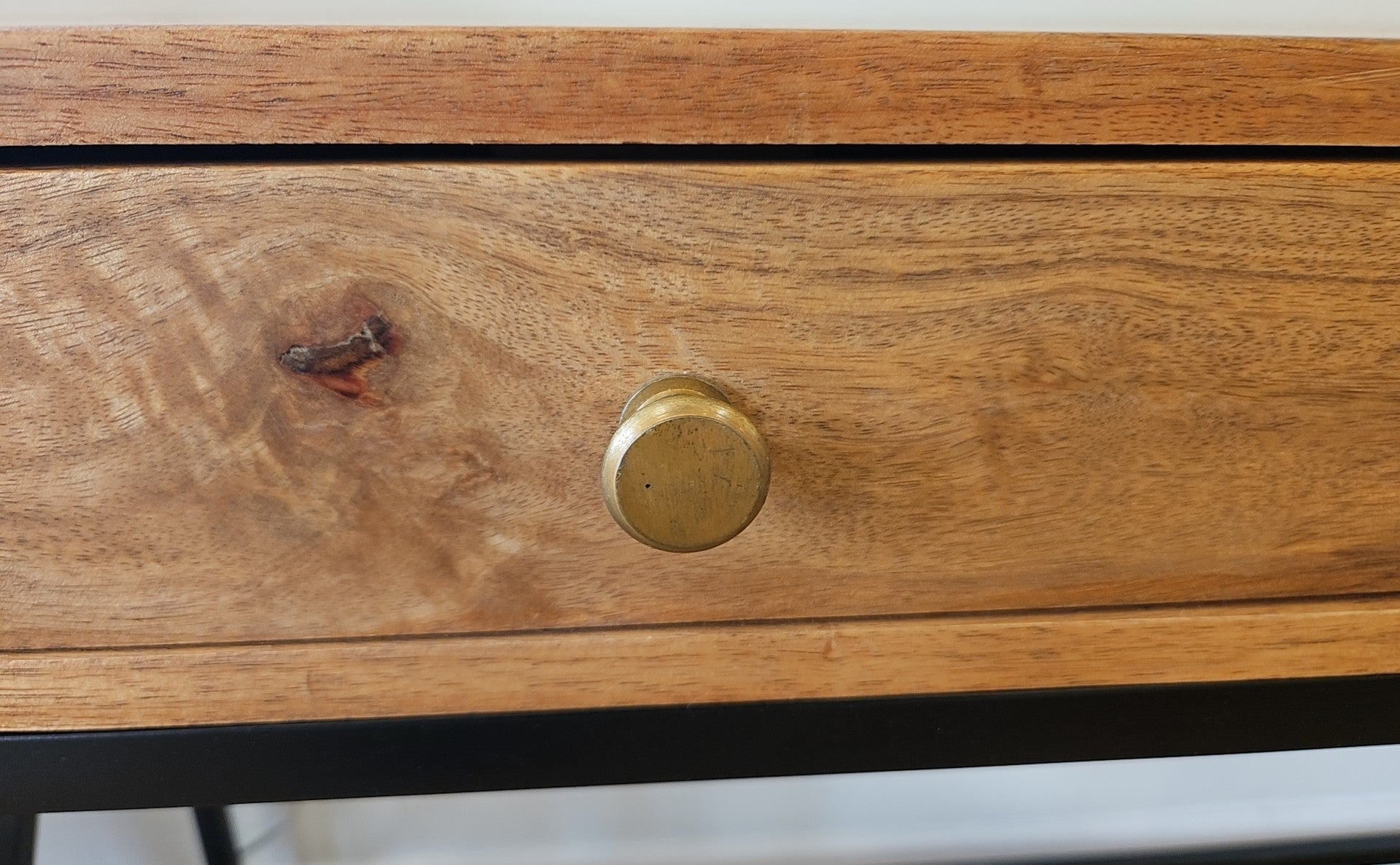 Rustic 2-drawer desk with black metal base, x-detail on sides, gold hardware