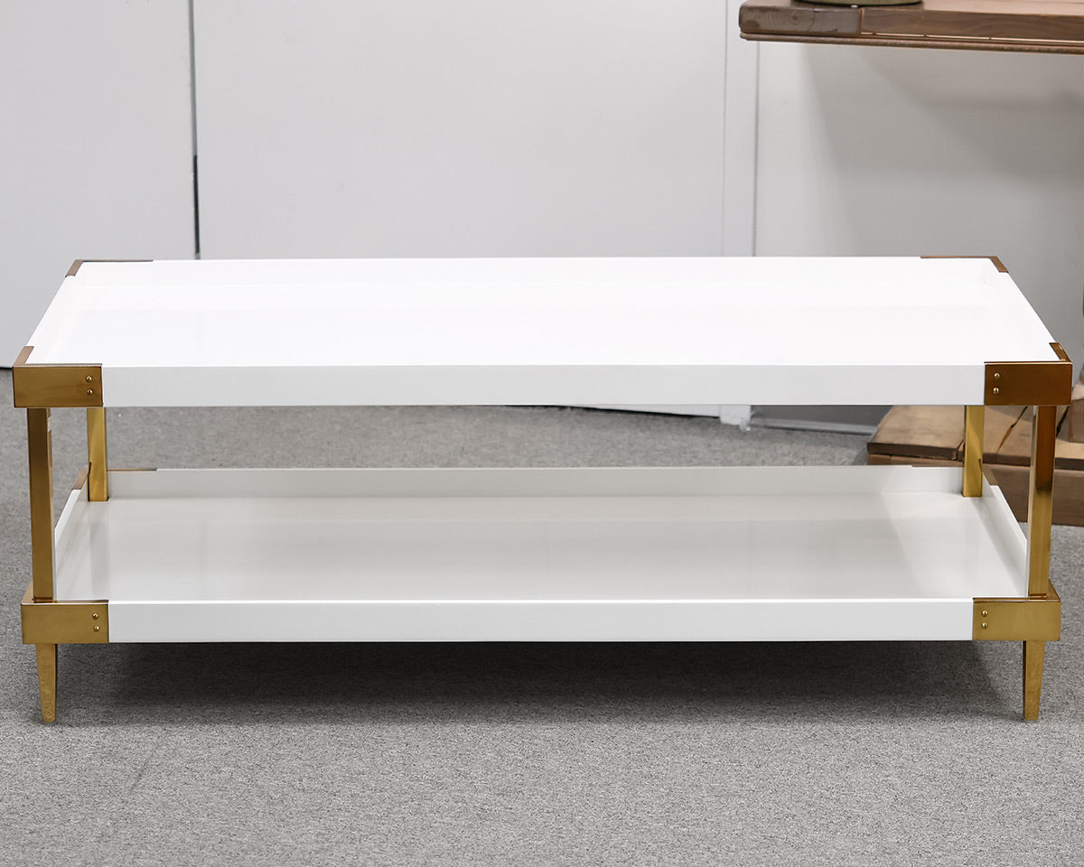 Rectangle Coffee Table in White Lacquer Finish With Brass Legs and Hardware.