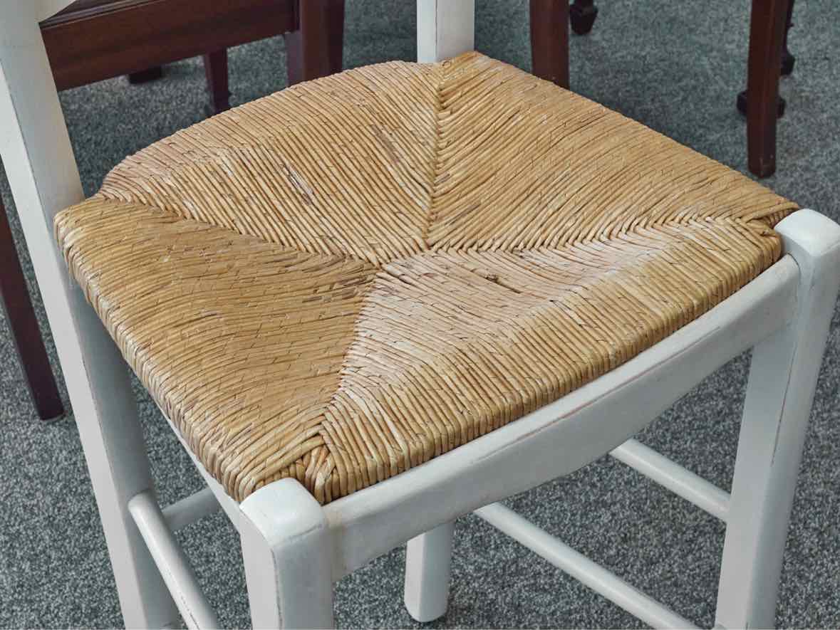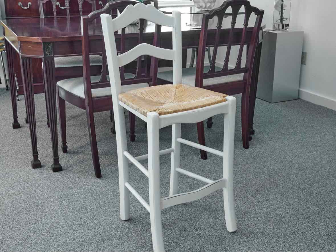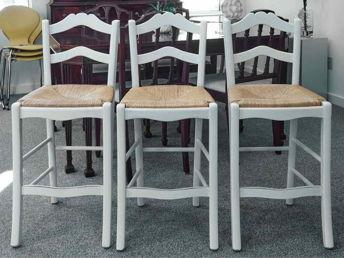 Set of 3 "Lemans" counter-height stools in cream with rush seats