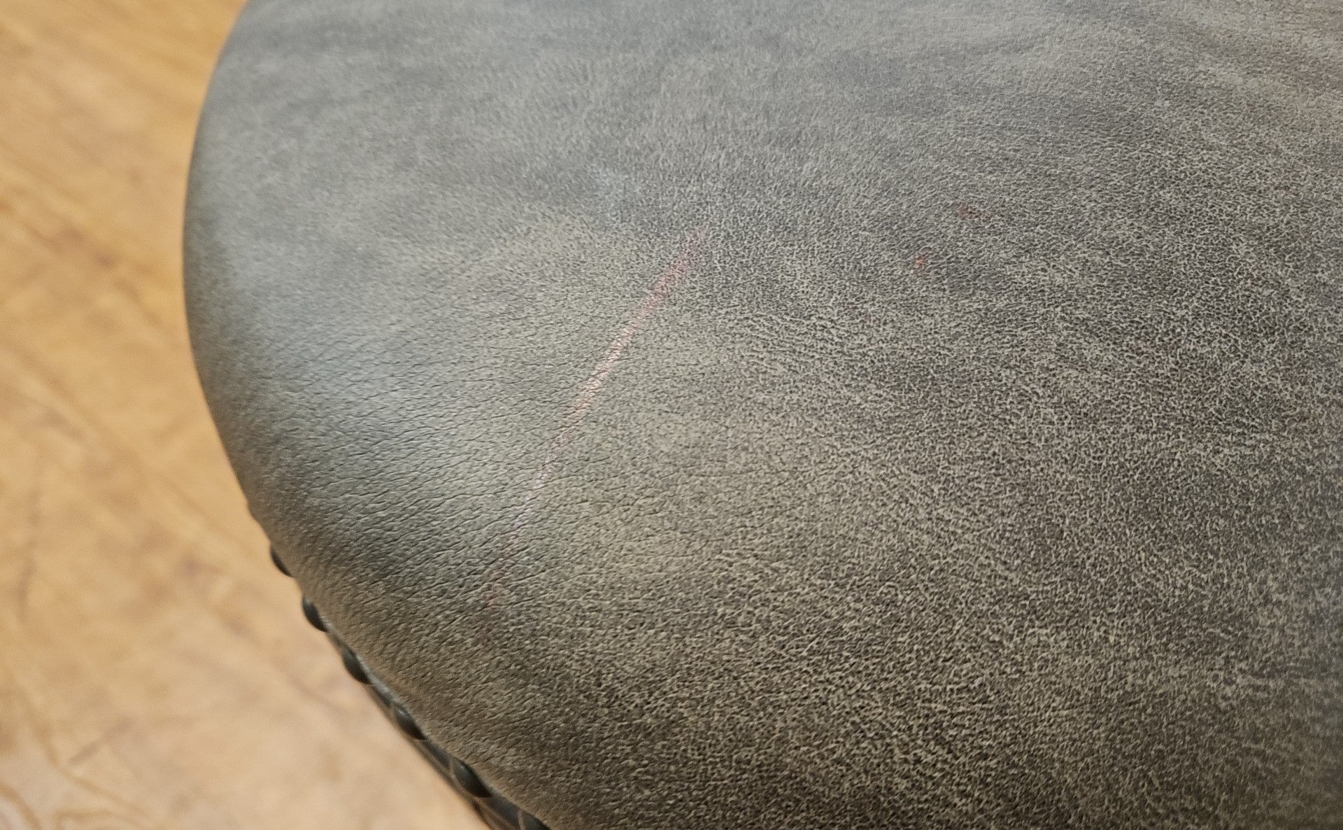 Set of 3 leather swivel counter stools in grey with nailhead trim, charcoal base